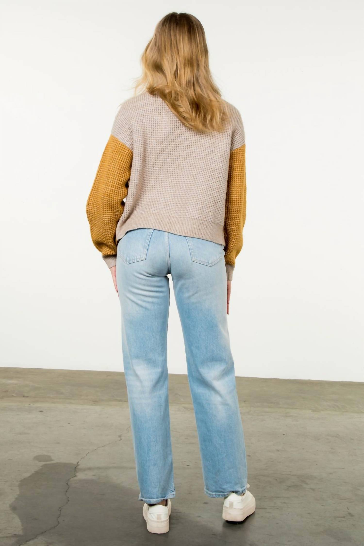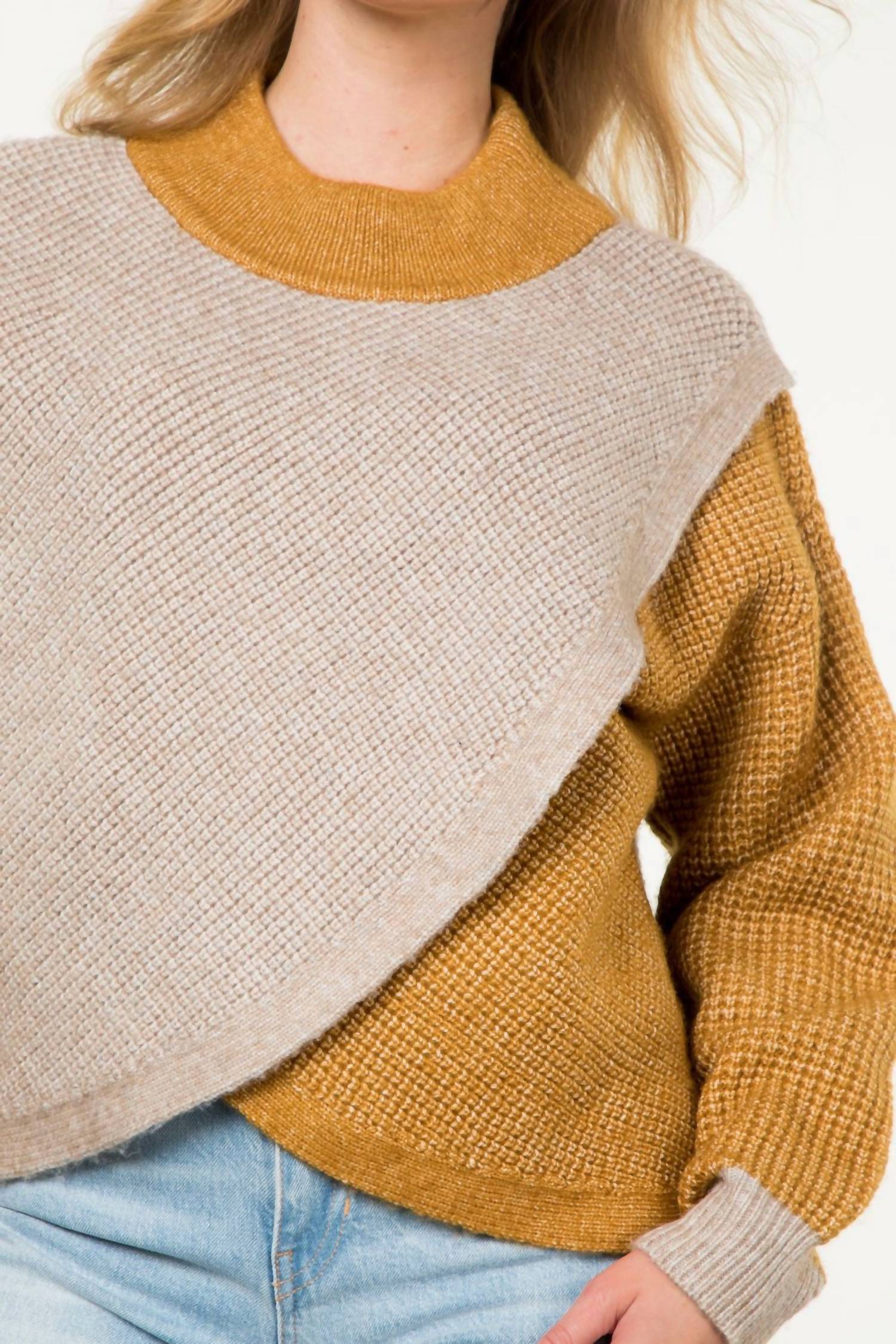 Stay warm and stylish in this versatile and effortlessly cool knitwear staple. Wear it alone or layered, it's the perfect sweater for the season and you'll wish you had it in every color. Introducing the Colorblock Knit Sweater by THML, a chic addition to your fall wardrobe that offers both warmth and style. This cropped, long sleeve turtleneck boasts a neutral tan colorblock design perfect for layering in cooler weather. Made for women with a pull-on closure, this sweater effortlessly combines sophistication and comfort. Embrace the season's trends with this fashionable piece.