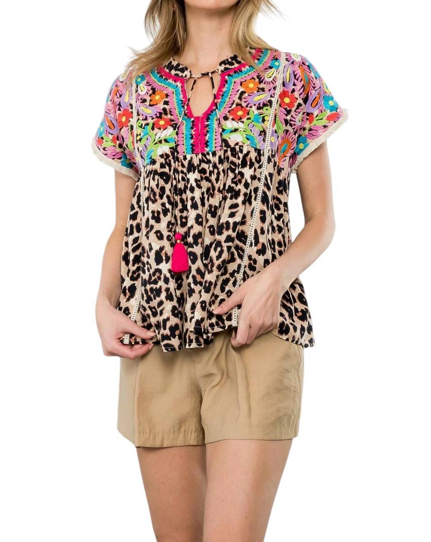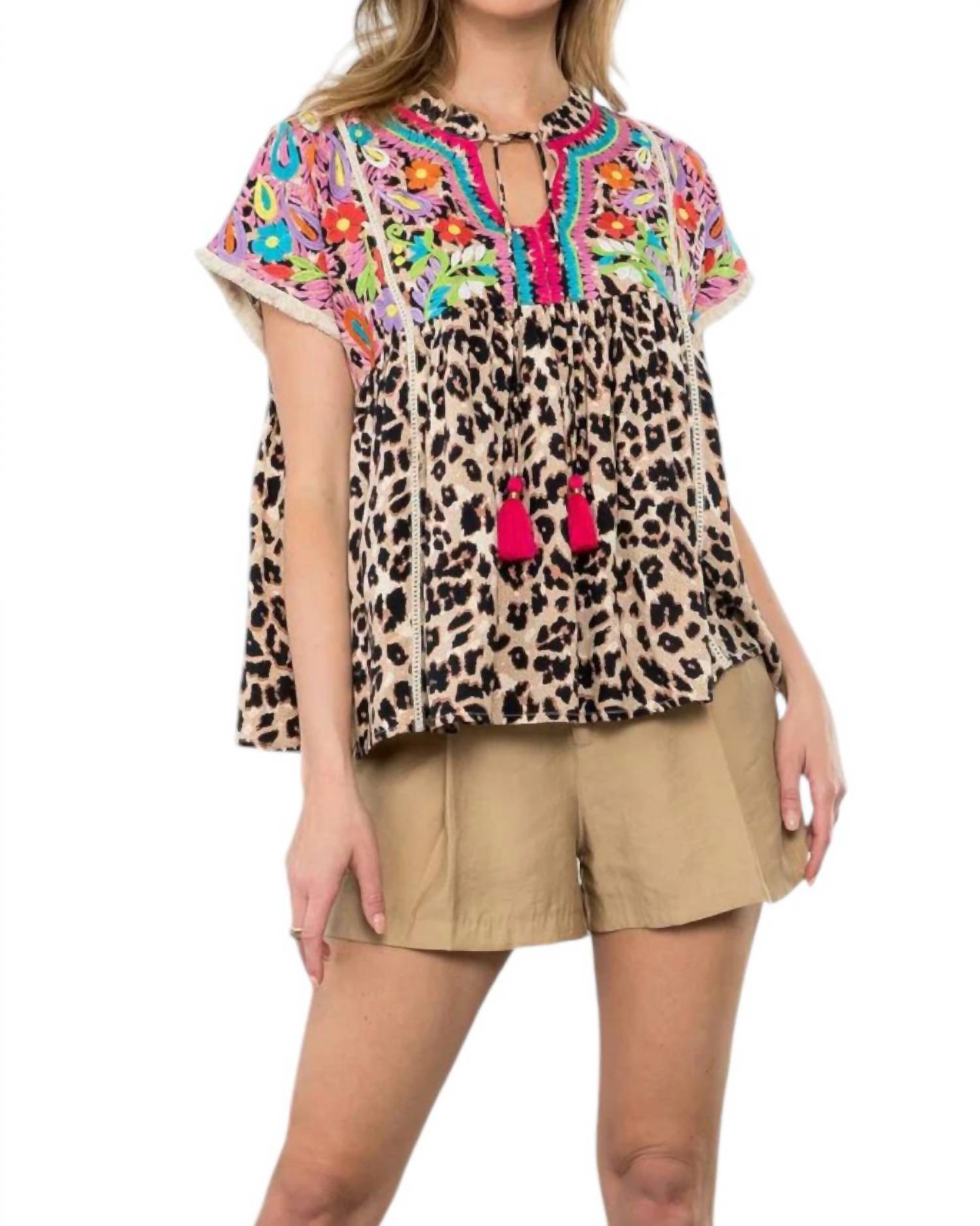 This classic, short sleeve tee will be your go-to staple this season and beyond.Alluring blend of boldness and sophistication. Short sleeve tee in an eye-catching leopard print. Crafted from 100% Viscose. Offering a luxuriously soft feel against the skin while ensuring breathability. Pull-on style. Accentuated by a chic collar neckline. Promises ease without compromising style. Thoughtful design originating in US. 24-inch body length provides a flattering fit. Ensuring comfort and style.