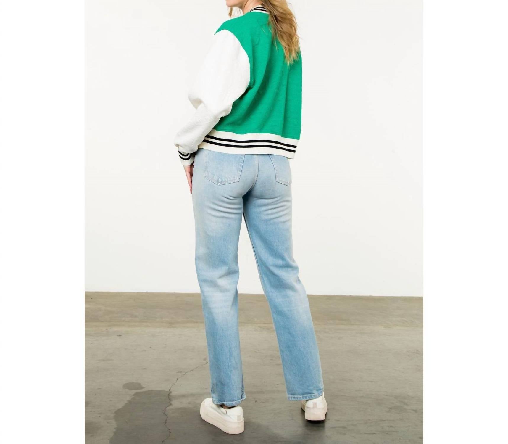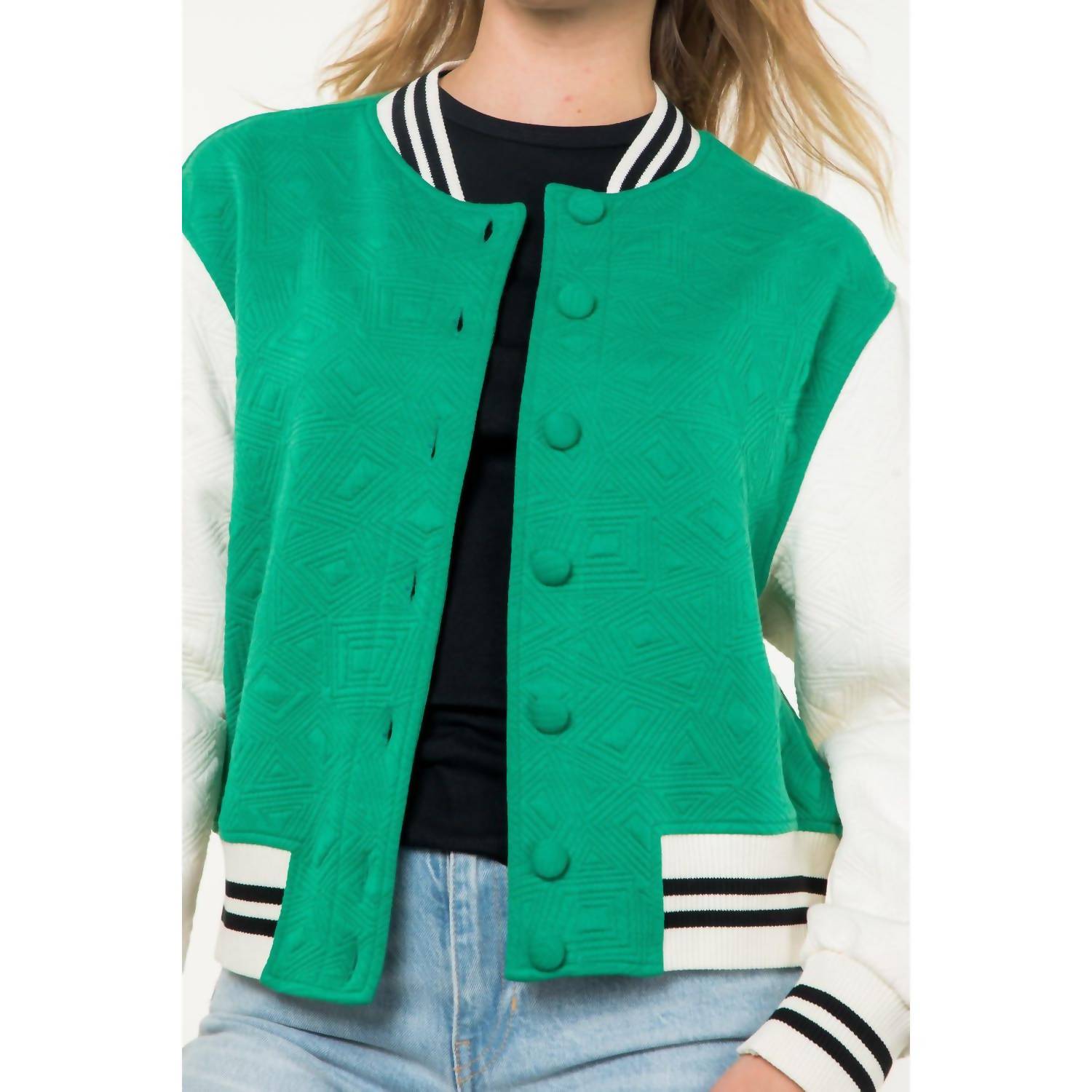 Giving off a vintage vibe, we love this varsity jacket style. Introducing the Lainey Jacket by THML, a chic varsity-style piece in eye-catching green and cream tones. Crafted with high-quality, textured fabric, this jacket exudes classic charm with its covered buttons. Ideal for adding a touch of elegance to your casual ensemble. Perfect for those seeking style and comfort in one timeless piece.