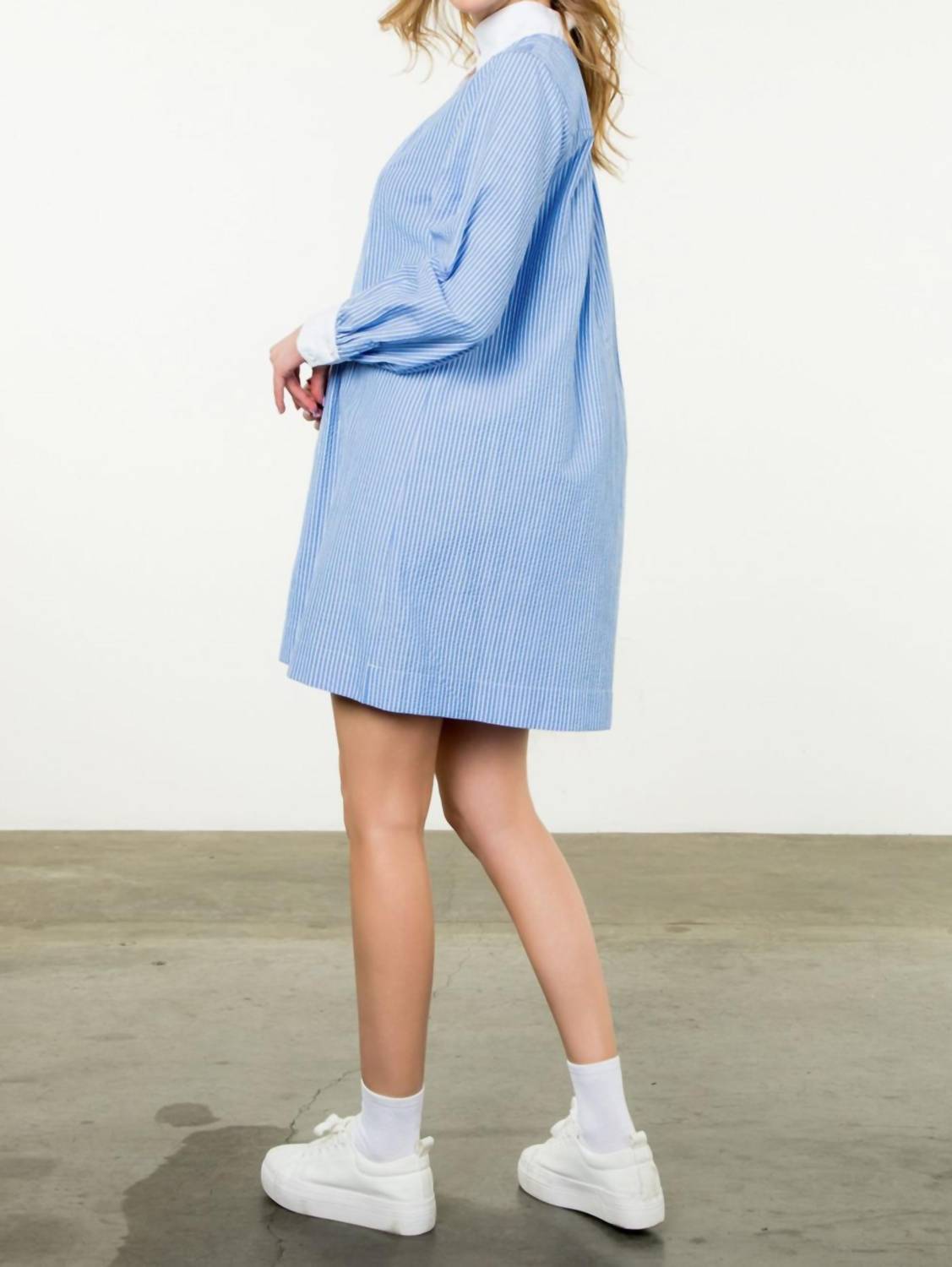 This Long Sleeve Striped Dress by THML brings a touch of sophistication to any holiday party attire. With its elegant contrast collar and cuffs, and a pleated front design, it encapsulates effortless chic. Made from 100% polyester, the dress features a pull-on closure for easy wear. Machine washable, it's an ideal choice for Thanksgiving and fall occasions, embodying a timeless 90s fashion trend.