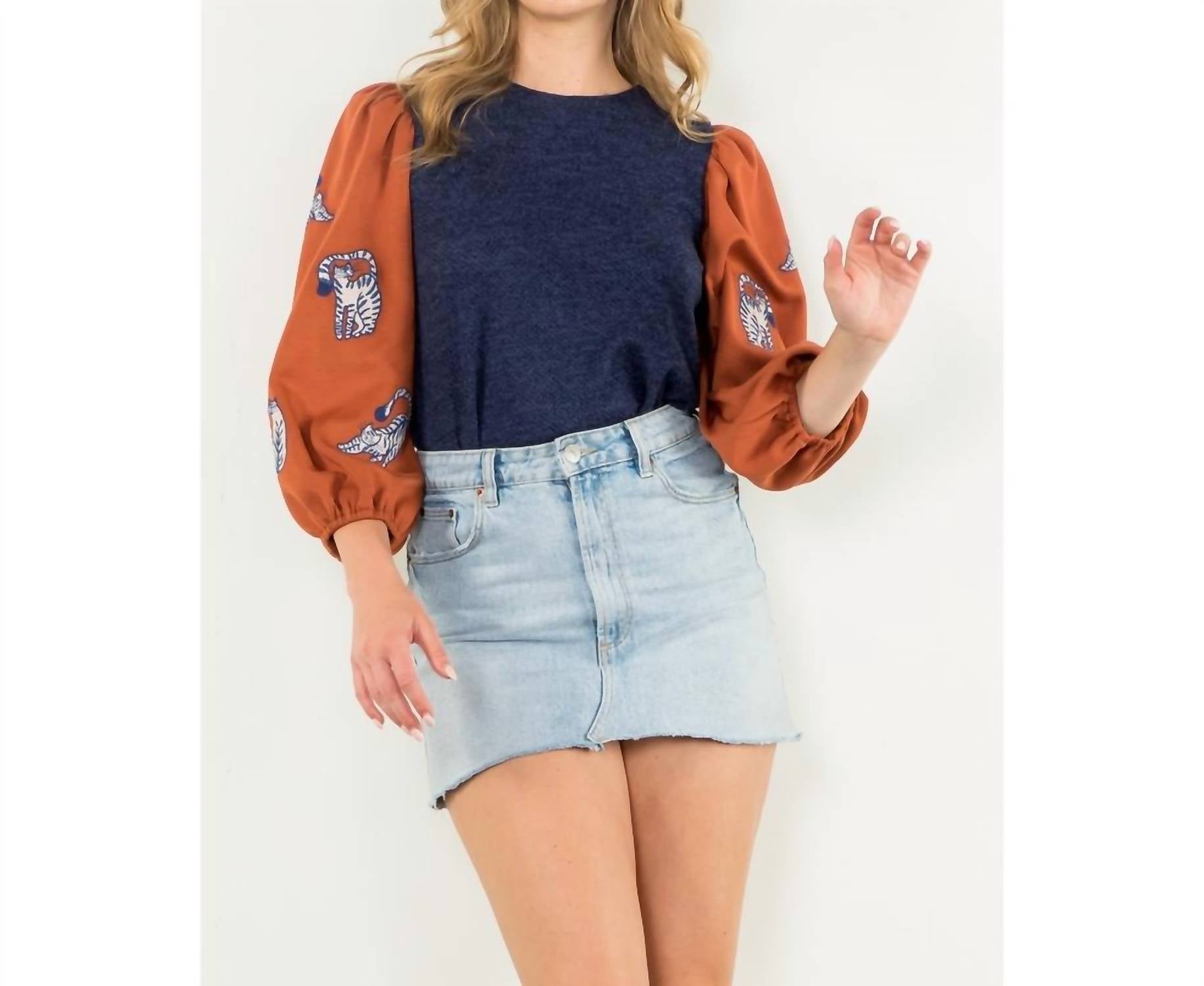 A versatile blouse that works from desk to dinner! Discover the Mixed Media Knit Top by THML, a chic addition to your wardrobe in a sophisticated navy hue. This top features three-quarter sleeves with a unique print, crafted from 97% Polyester and 3% Cotton, offering comfort and style. Garment Length: 23.5 inches, tailored to perfection. Closure: Pull on style. Care: Machine wash for easy maintenance.