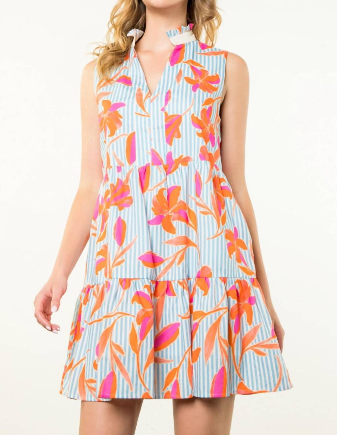 The kind of easy and flattering dress you'll be reaching for all season long. Embrace summertime style with the Sleeveless Flower Striped Dress by THML in a delicate light blue. This A-line mini dress is crafted from 100% cotton, highlighting a tiered design with a charming floral pattern. Featuring a v-neckline and a trendy boho chic appeal, the dress is perfect for holiday parties and Easter celebrations. The pull-on style ensures an easy fit, making it a must-have for your summer wardrobe.
