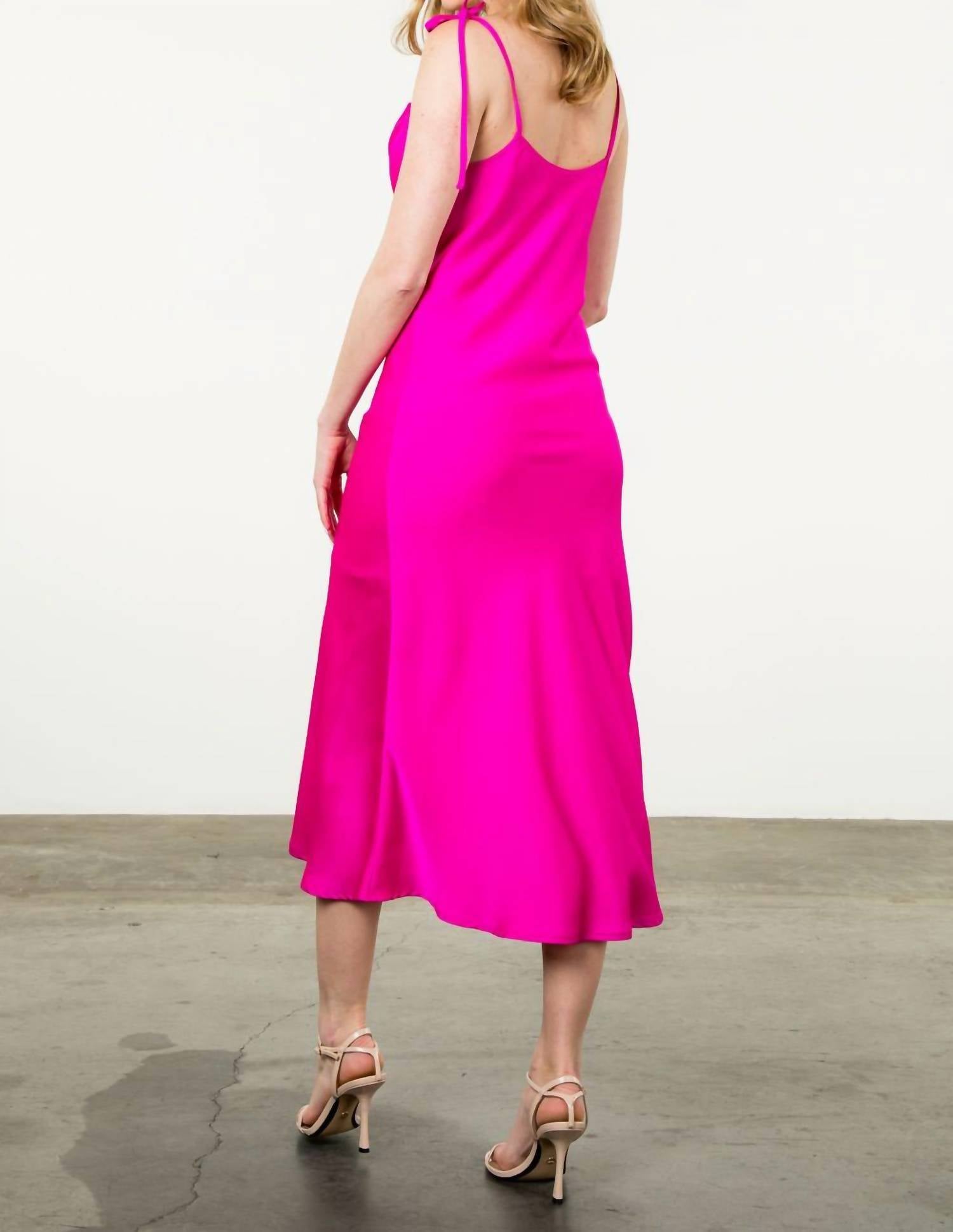 A midi dress so versatile, your options for wearing it are endless. Elevate your wardrobe with the THML Spaghetti Strap Midi Dress, a stunning piece crafted for the modern woman in vibrant fuchsia. This sheath silhouette dress features delicate spaghetti straps and a flattering sweetheart neckline, offering a chic and sophisticated look. Made from 100% polyester, it has a body length of 45 inches with a bust width of 38 inches and is secured with a tie closure. Model is wearing a size S and stands at 5'9", with measurements of 32" bust, 25.5" waist, and 36" hips. Designed in USA.