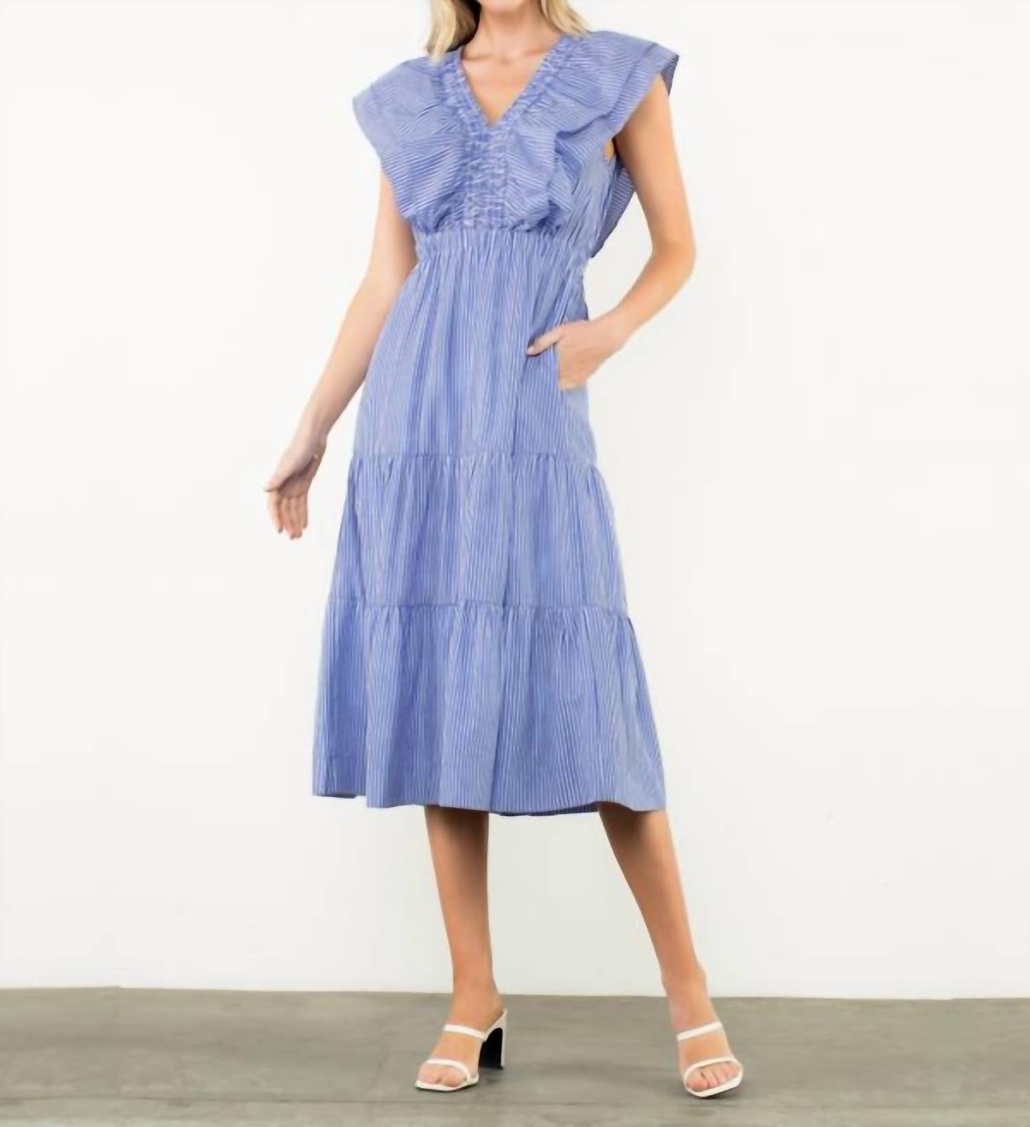The Striped Flutter Maxi Dress by THML is a striking addition to any summer wardrobe. It features cap sleeves and a flattering V-neckline, crafted from 100% polyester with a tiered A-line silhouette that embodies nostalgic 90s fashion. The blue and white stripes enhance its eye-catching appeal, while handy pockets add a practical touch. Perfect for vacations, this dress combines style and functionality effortlessly.