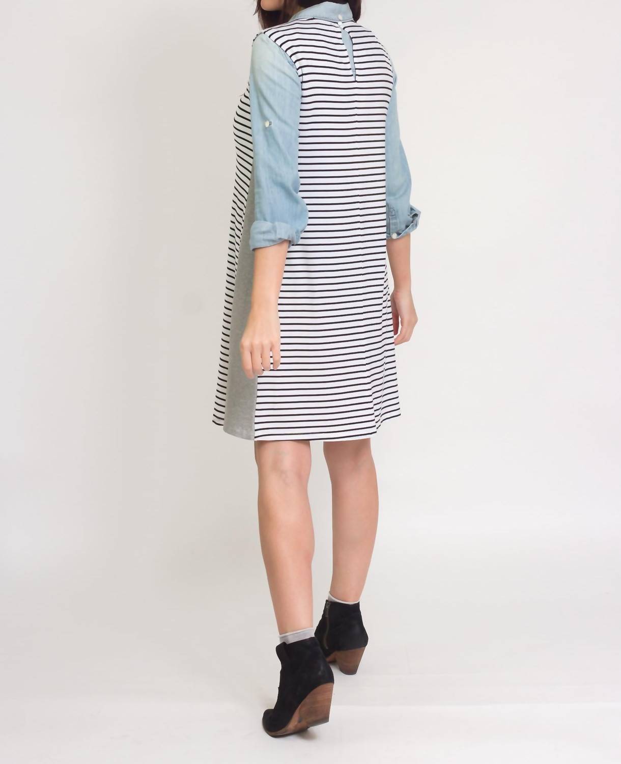 Introducing the Tara Embroidered Stripe Dress by THML, an eye-catching addition to your spring wardrobe with a maximalist flair. This women's mini dress features short sleeves and a charming embroidered bib detail on a black and white stripe pattern. Crafted from 95% rayon and 5% spandex, it offers a comfortable A-line silhouette and a convenient single button back closure. Care for this vacation-ready piece by hand washing or opting for a dry clean.
