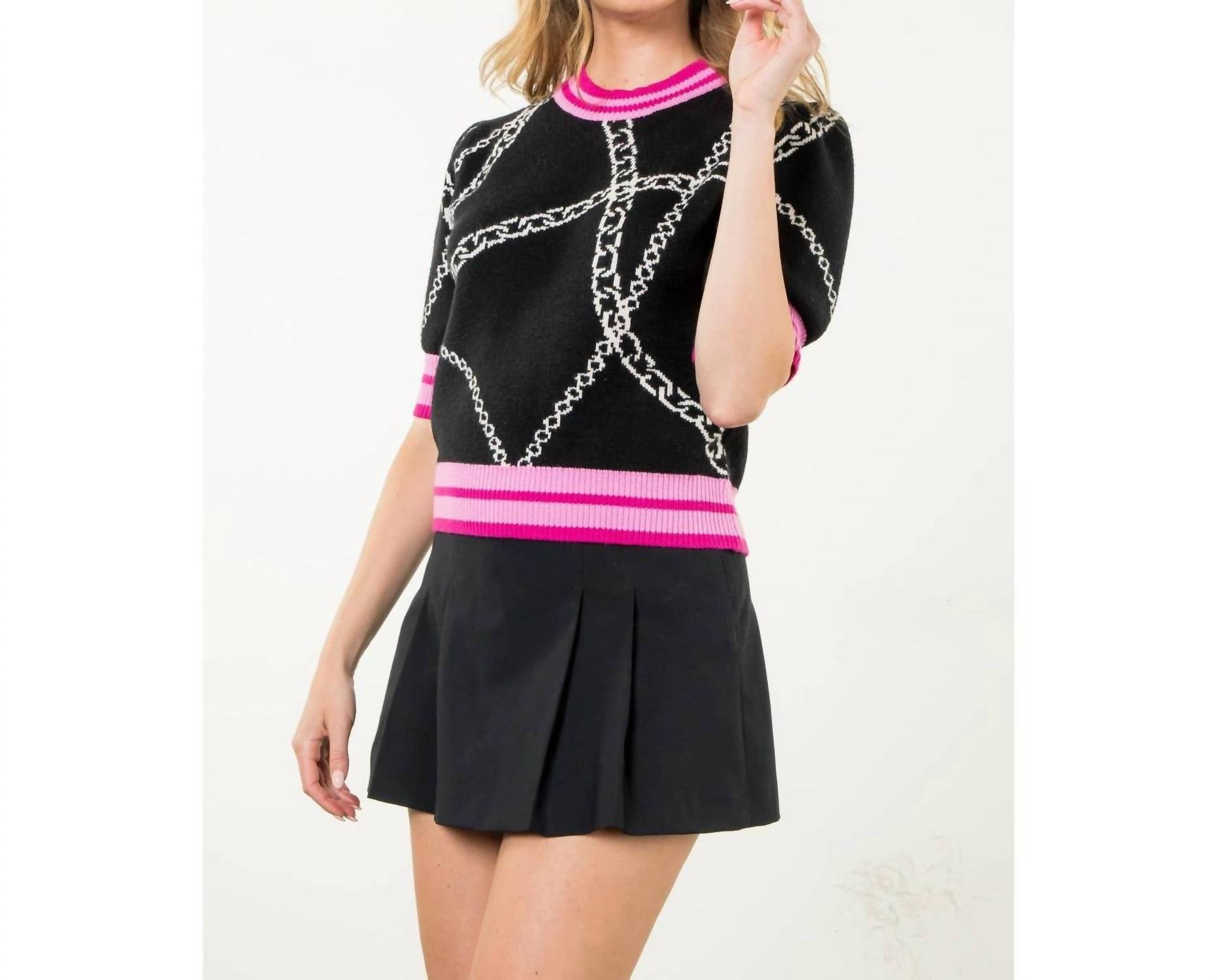Stay warm and stylish in this versatile and effortlessly cool knitwear staple. Wear it alone or layered, it's the perfect sweater for the season and you'll wish you had it in every color. Introducing the Tila Print Short Sleeve Sweater by THML, a striking piece for your streetwear collection. Crafted from a luxurious blend of 43% Viscose, 32% Nylon, and 25% Polyester, this sweater offers both comfort and style. Featuring a patterned design with a chain print, striped collar, and distinctive hem details, it combines elements of black, white, and fuchsia for a bold winter palette. With a convenient pull-on closure, care is easy with a simple hand wash.