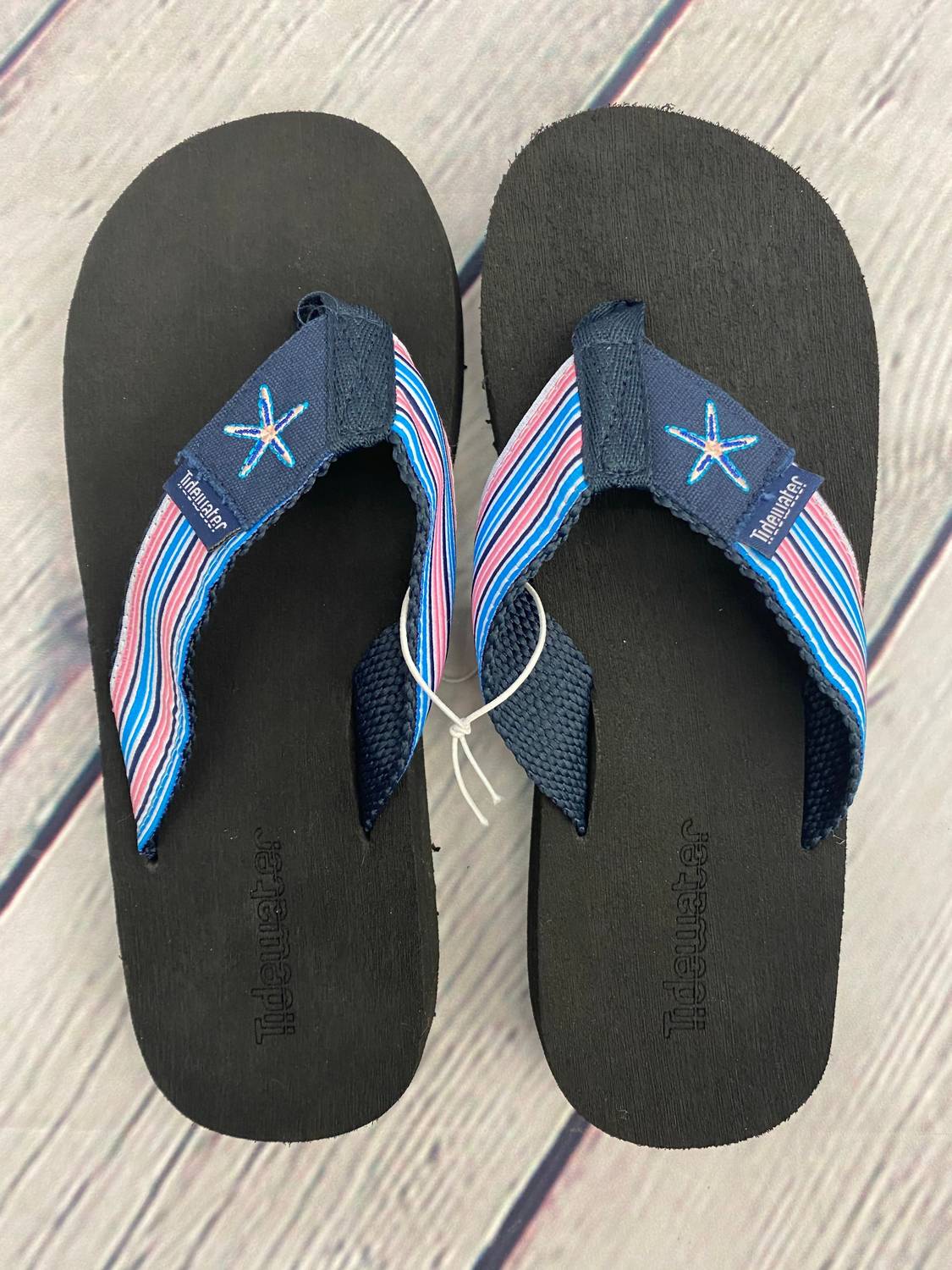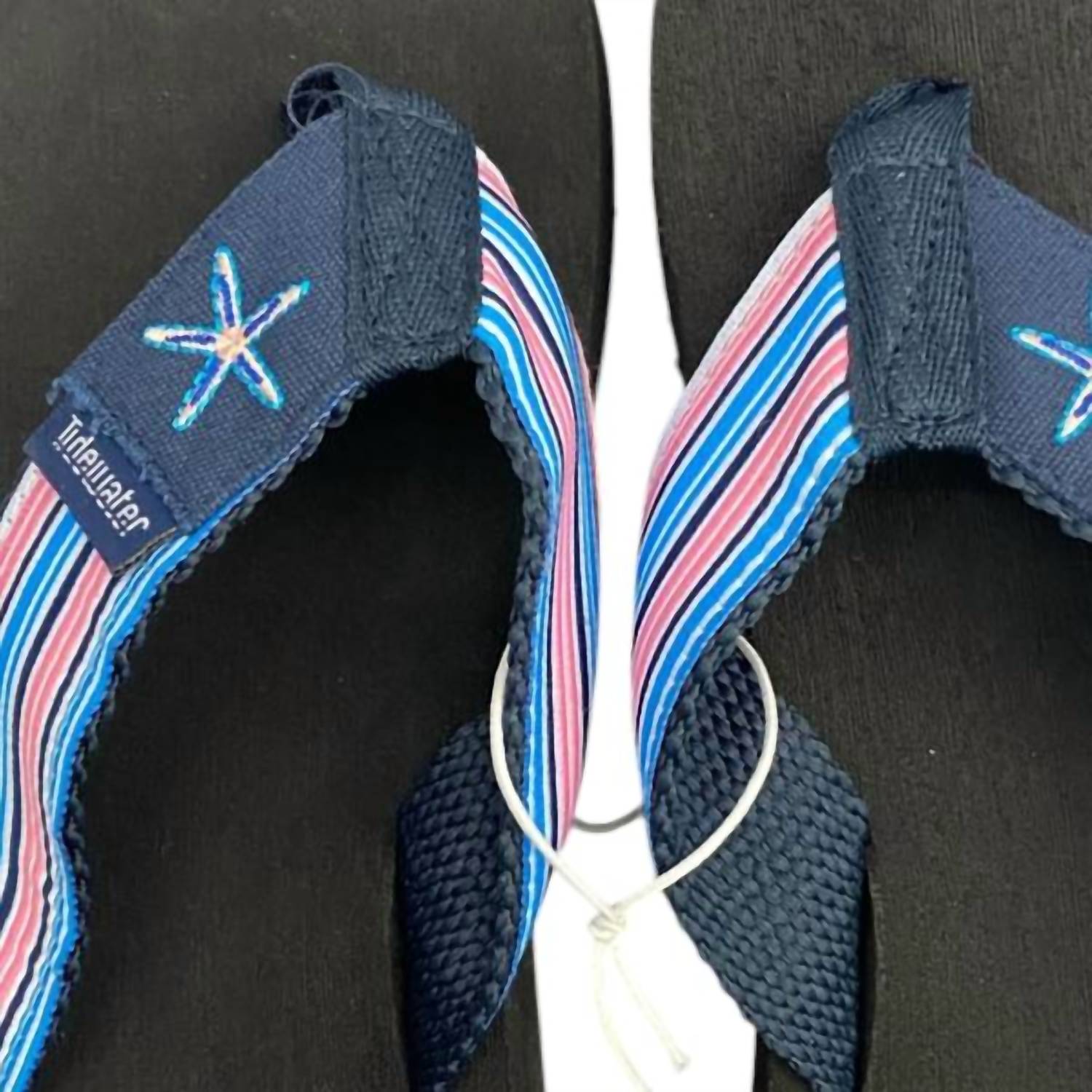 Classicly cute and all-day-wearable. We love this sandal. Elevate your summer style with the Tidewater Women's Flip Flop Sandals in the enchanting Starfish Stripes design. Perfect for beach days, these sandals present a flat heel measuring 1 inch or under, ideal for adult wearers seeking comfort paired with a touch of oceanic charm. Designed with a streetwear trend in mind, they seamlessly blend into any casual occasion. A must-have for your seasonal wardrobe, this coastal-inspired footwear promises both style and ease for your adventures.