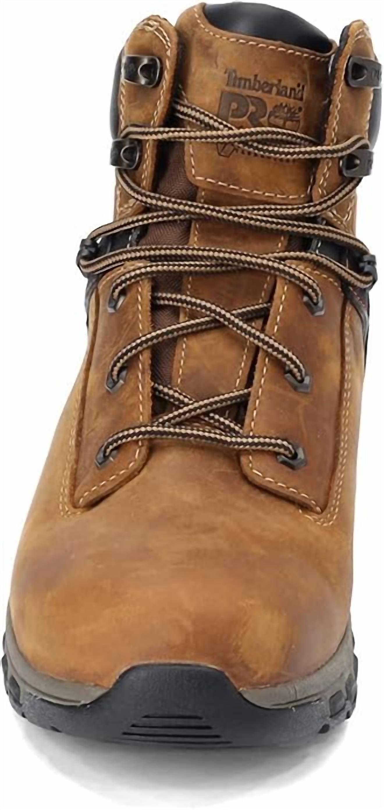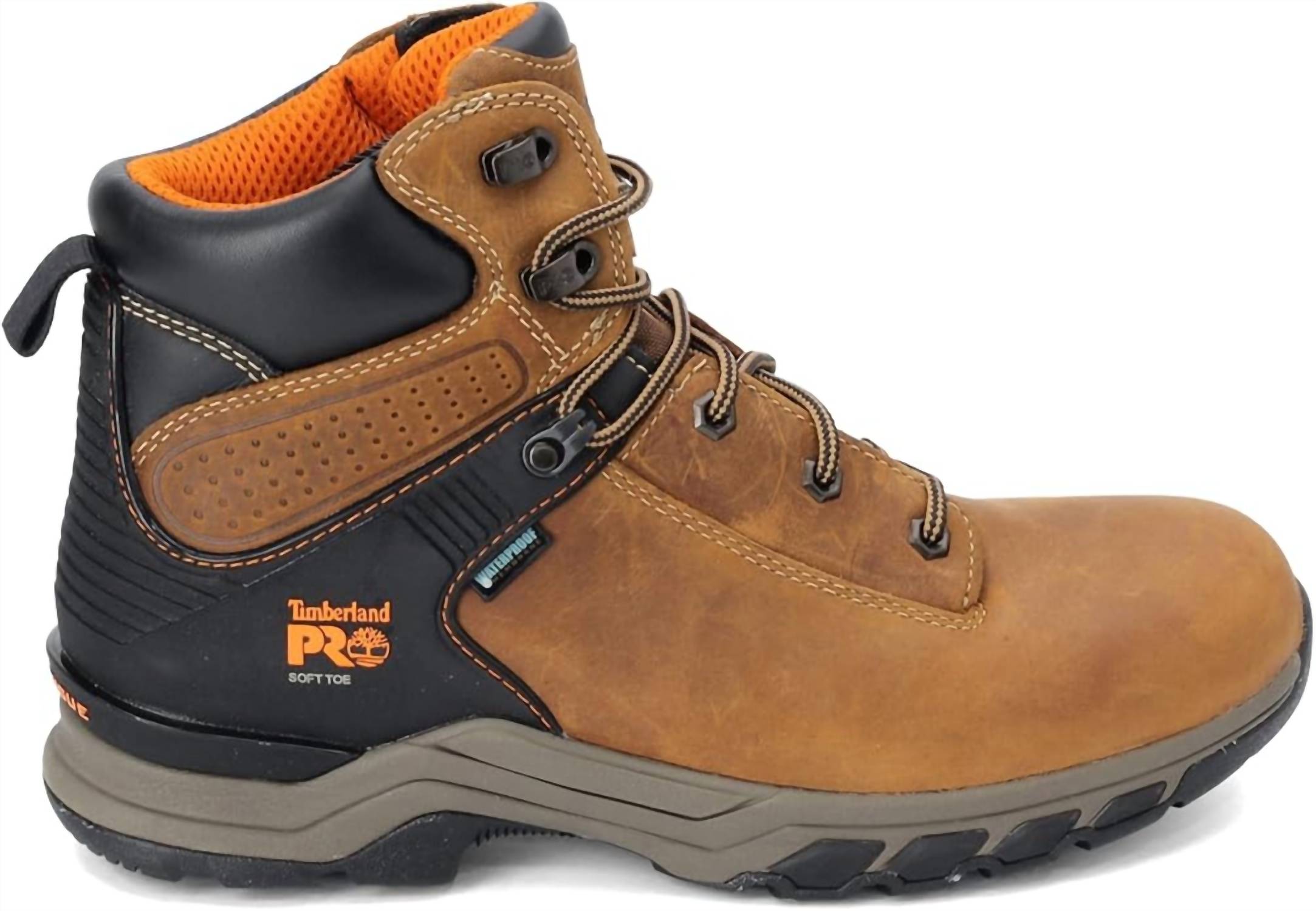 The Timberland Men's Hypercharge 6" Waterproof Industrial Work Boot in brown is a robust choice designed for comfort and durability. Crafted with premium waterproof full-grain leather and featuring a breathable lining, these boots are designed to resist odors while ensuring moisture-wicking capabilities. Key features include a round toe, lace-up closure, and a rubber sole, paired with anti-fatigue technology for superior shock absorption. The design integrates an EVA midsole, slip-resistant rubber outsole, and a stable stride technology platform for enhanced support and agility.