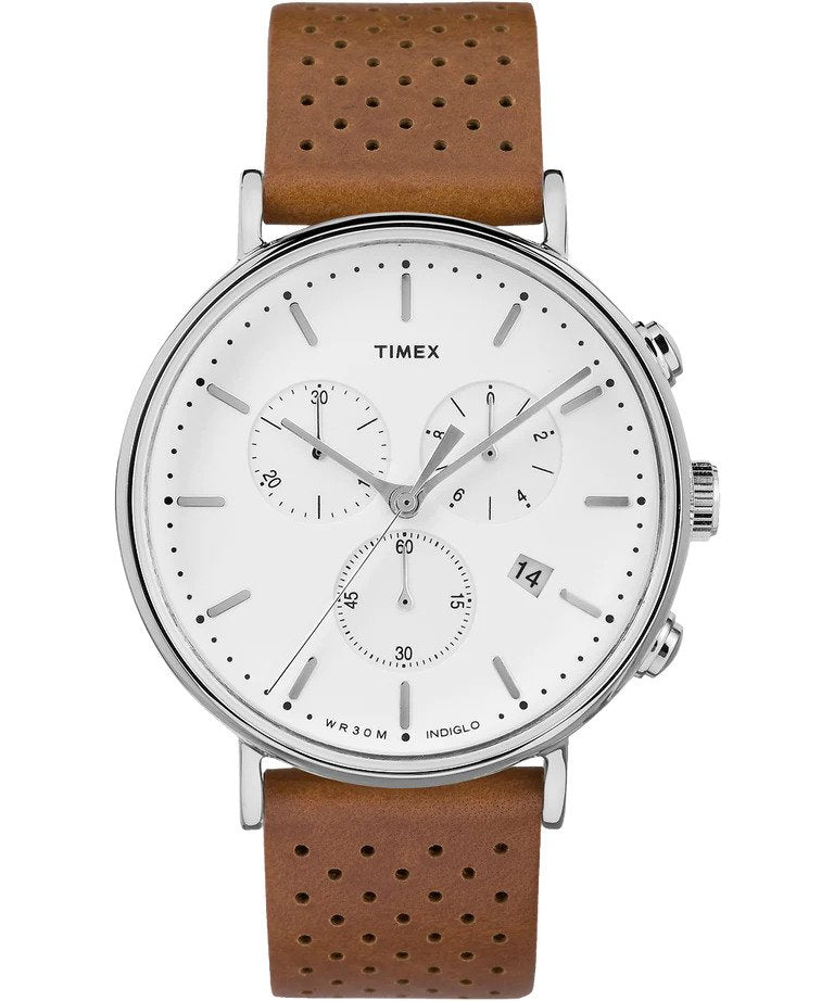 The case of this watch is constructed of high-quality stainless steel. The dial is white and protected by a durable mineral crystal with up to 30 m (100 feet) water resistance. The strap is brown leather. The movement is quartz