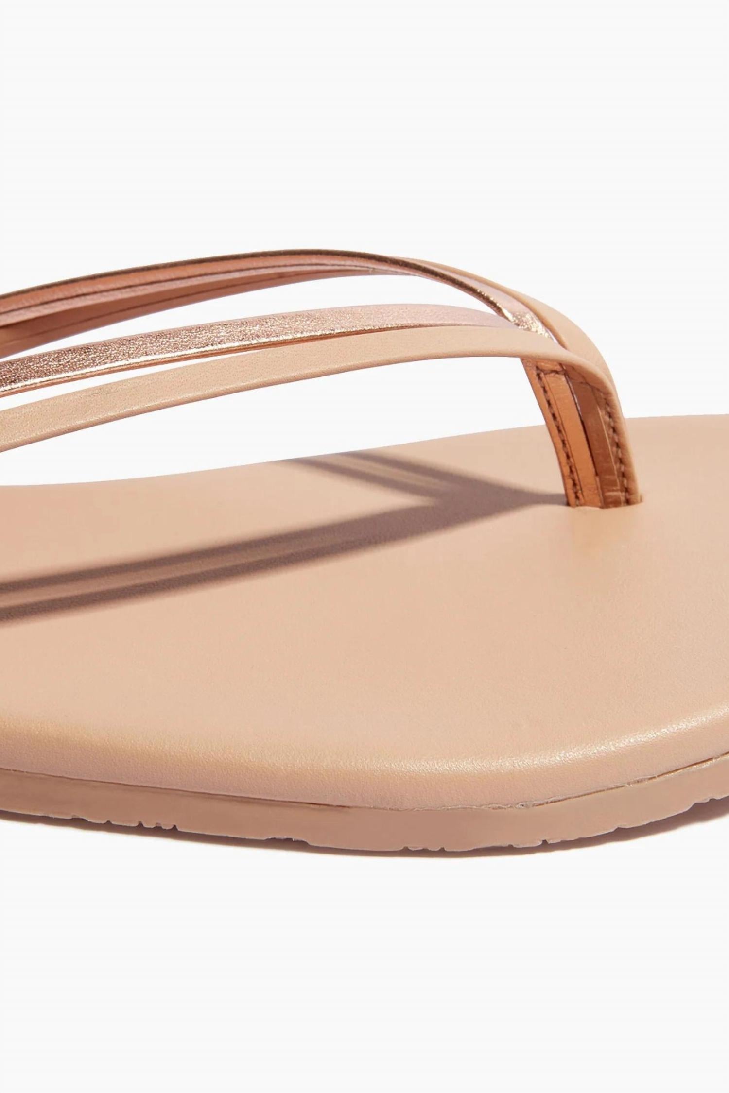 Introducing the Women's Duos Flip Flop by TKEES, featuring a classic silhouette with two delicate, contrasting straps in a sparkling rose hue. Crafted with a leather upper and insole for a polished look, the flip flop also includes a durable rubber outsole. This glamorous design is proudly made in Brazil. Perfect for those who need to size up when between measurements, it's available in US whole sizes.