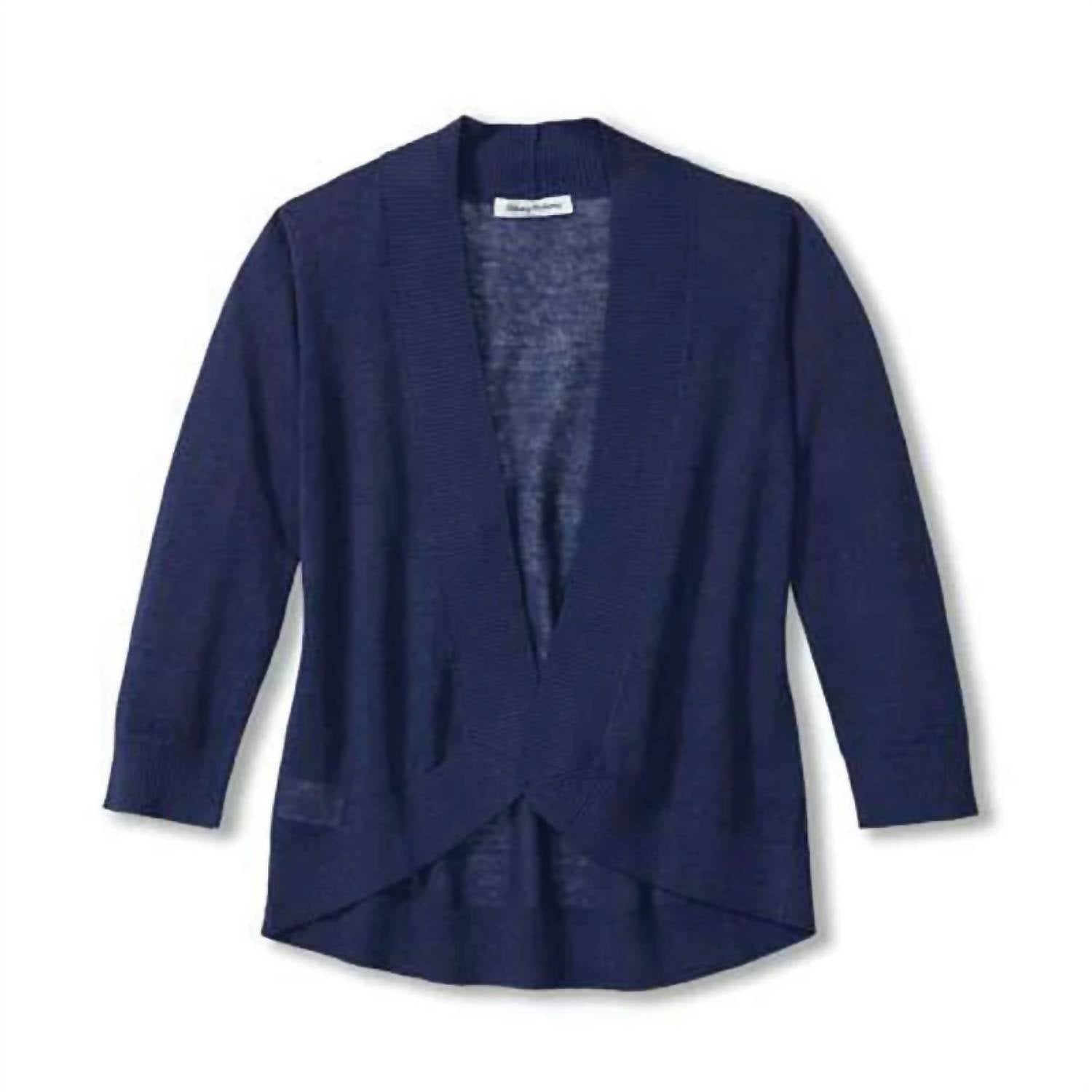 This cardigan will be a sweater-rotation favorite. Elevate your vacation wardrobe with the Tommy Bahama Open Linen Cardigan, a timeless piece in a rich navy hue. This cardigan features three-quarter-length sleeves and is crafted from 100% lightweight linen, ensuring a beautiful drape. Designed without a closure, it boasts ribbing at the placket, hem, and cuffs for a modern touch. With a length measuring 24 inches from shoulder to hem and imported quality, it is ideal for layering over your favorite outfits. Care instructions specify hand wash cold and lay flat to dry, with dry cleaning as an option.