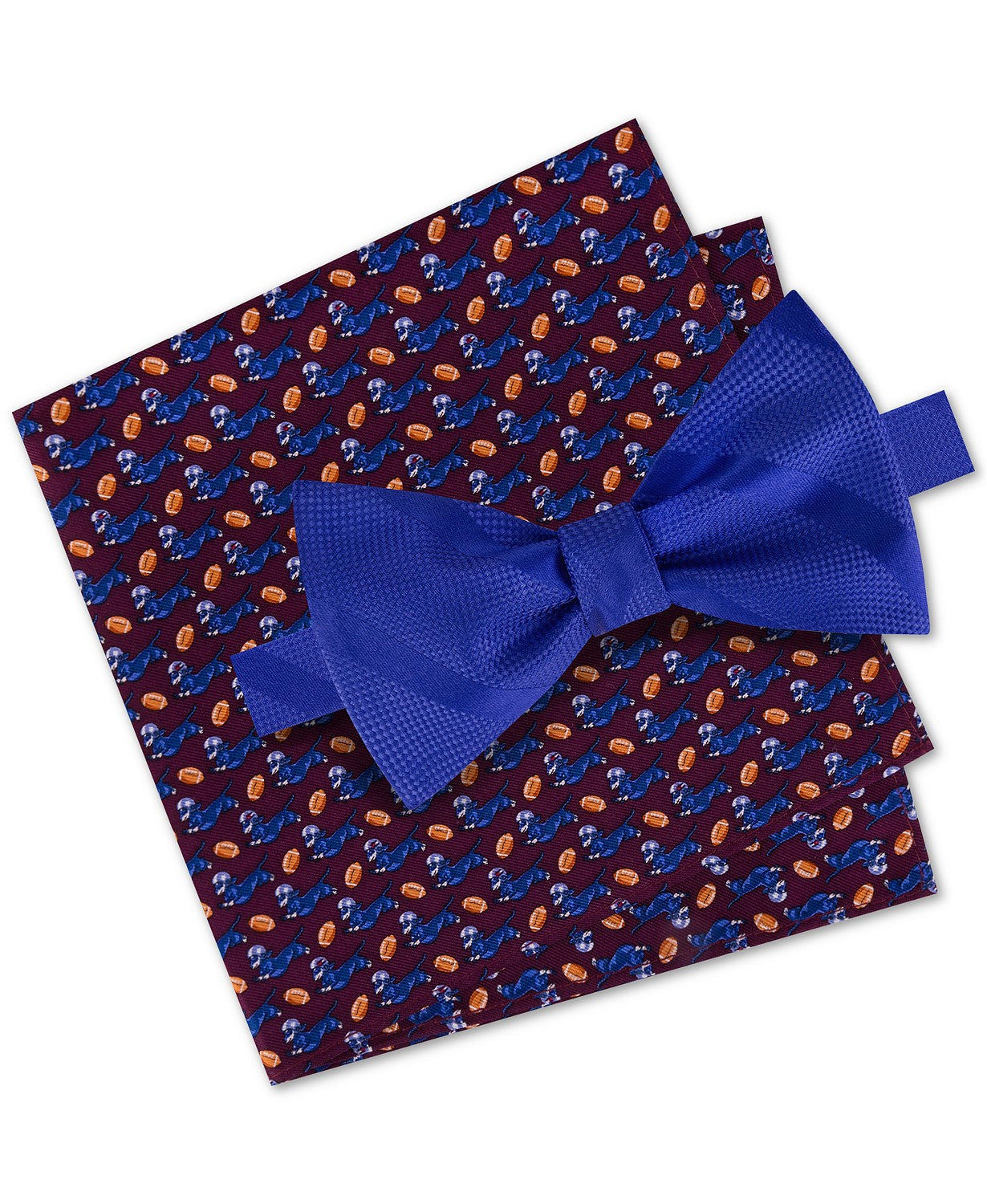 Pre-tied bow tie and pocket square set|13" x 13" wide pocket square|Tonal stripe pattern (bow tie); Football wiener dog pattern (pocket square)