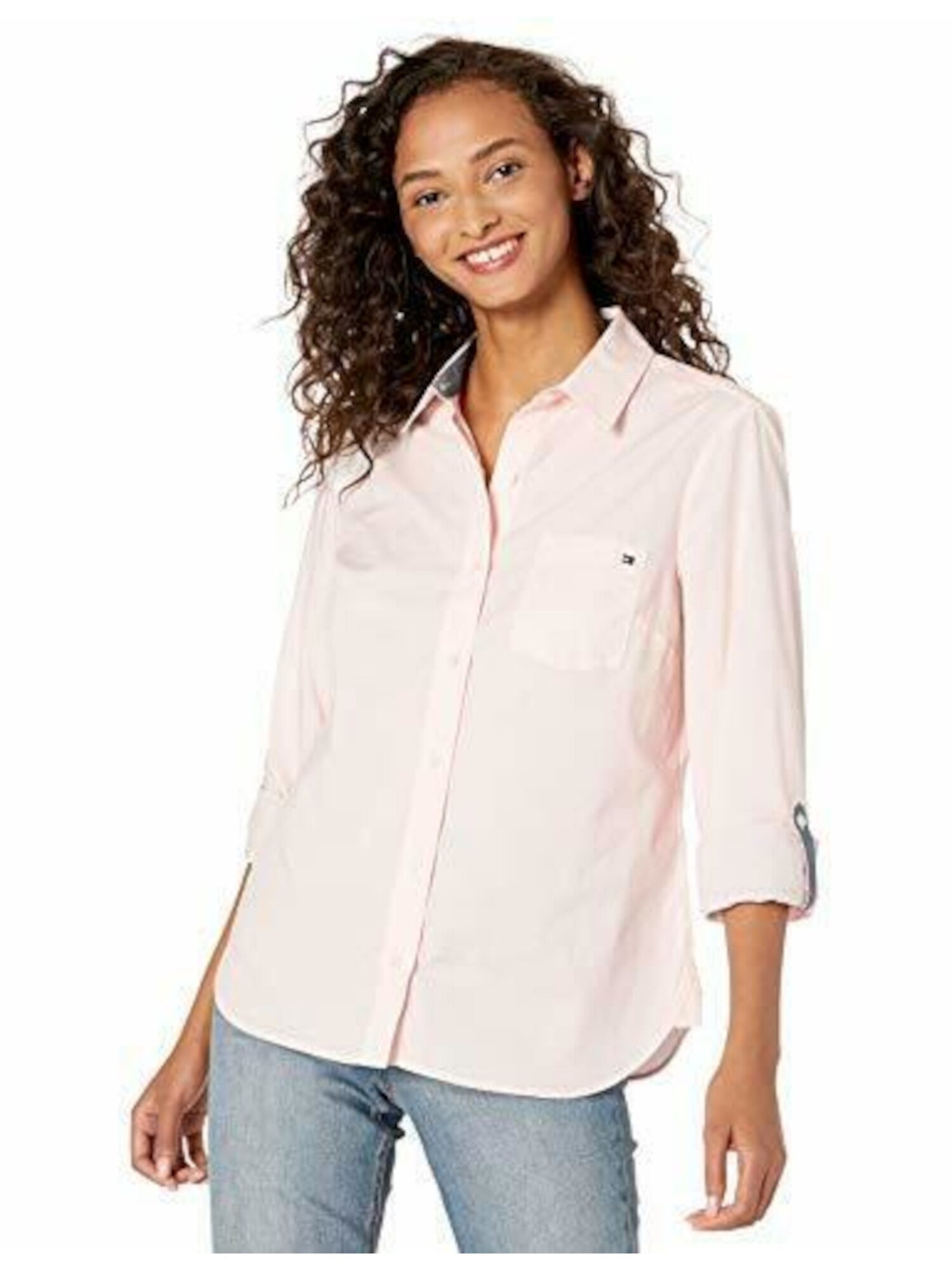 Tommy Hilfiger Women's Button Down Solid 3/4 Roll Tab Long Sleeve Top Pink Size Small