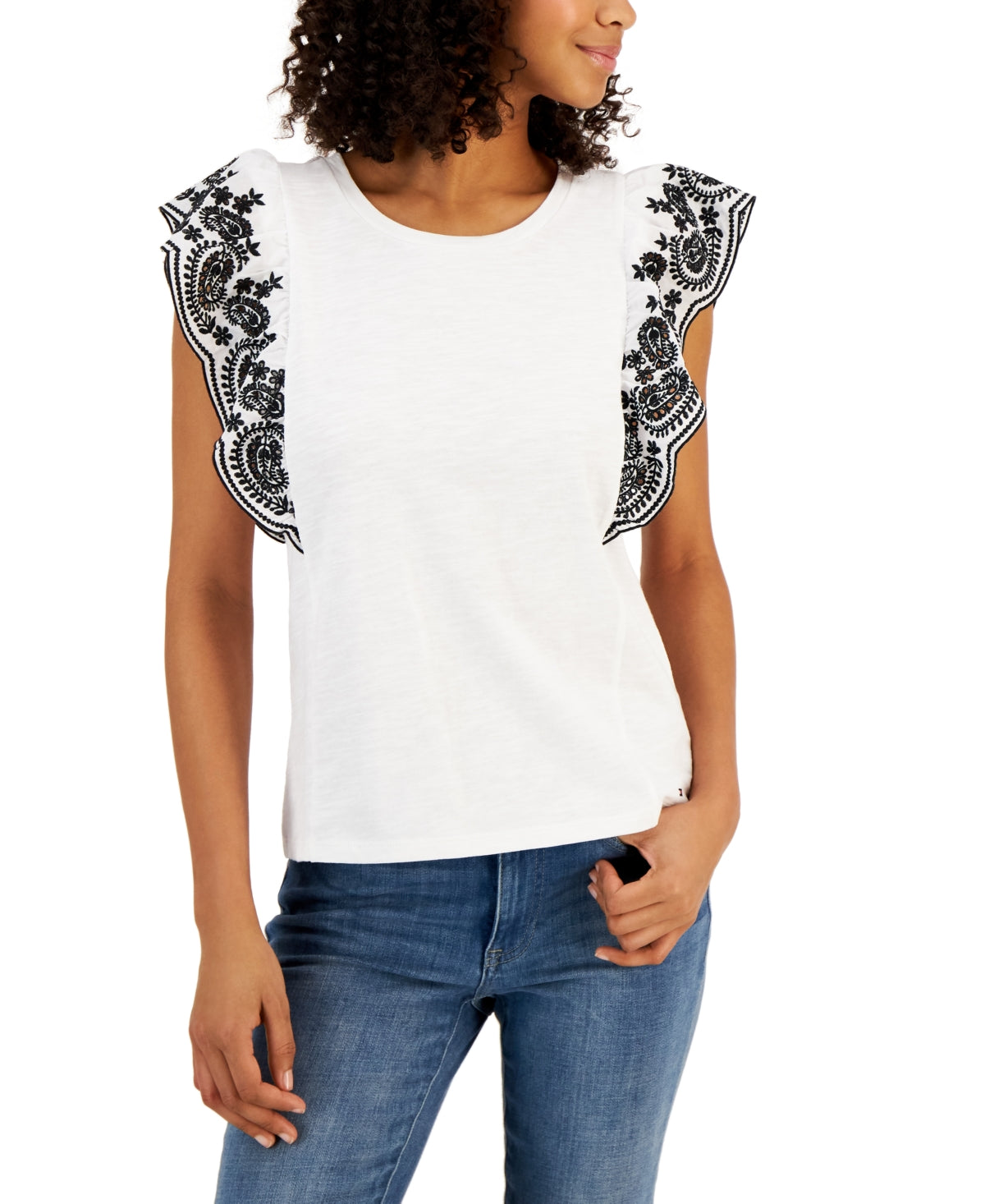 Cool and breezy in all cotton| this Tommy Hilfiger top polishes your look with embroidered eyelet flutter sleeves.| Approx. 23-1/2 long| Crewneck| Embroidered eyelet flutter sleeves| All cotton| Machine washable