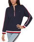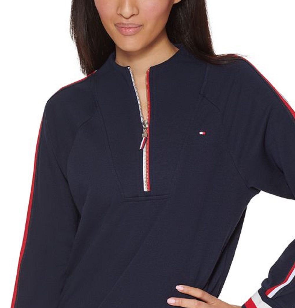 Wrap up your casual look in this sporty half-zip top from Tommy Hilfiger designed with a funnel neckline and bold stripes.| Approx. 25-1/2 long| Funnel neckline; front zipper closure| Flag embroidery at chest; stripes at sleeves| cuffs and hem| Cotton/polyester| Machine washable