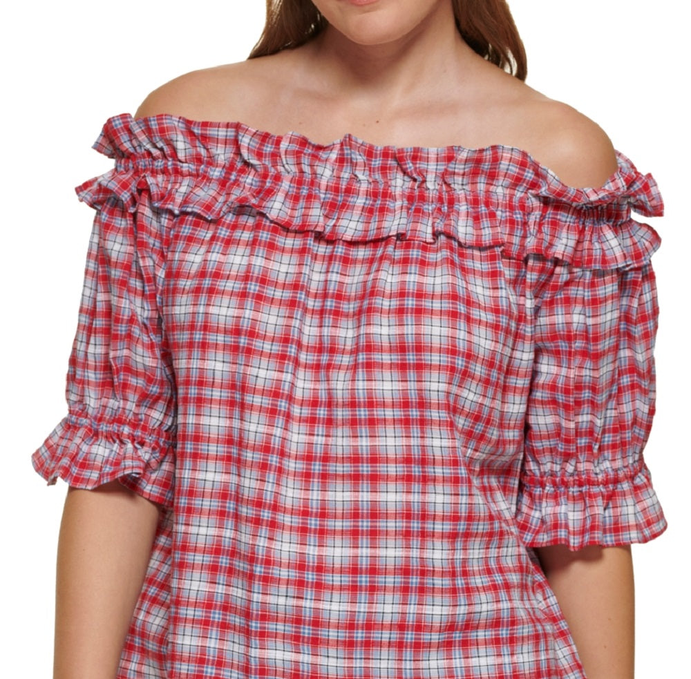 Tommy Hilfiger Women's Plaid Off The Shoulder Top Red Size XX-Large