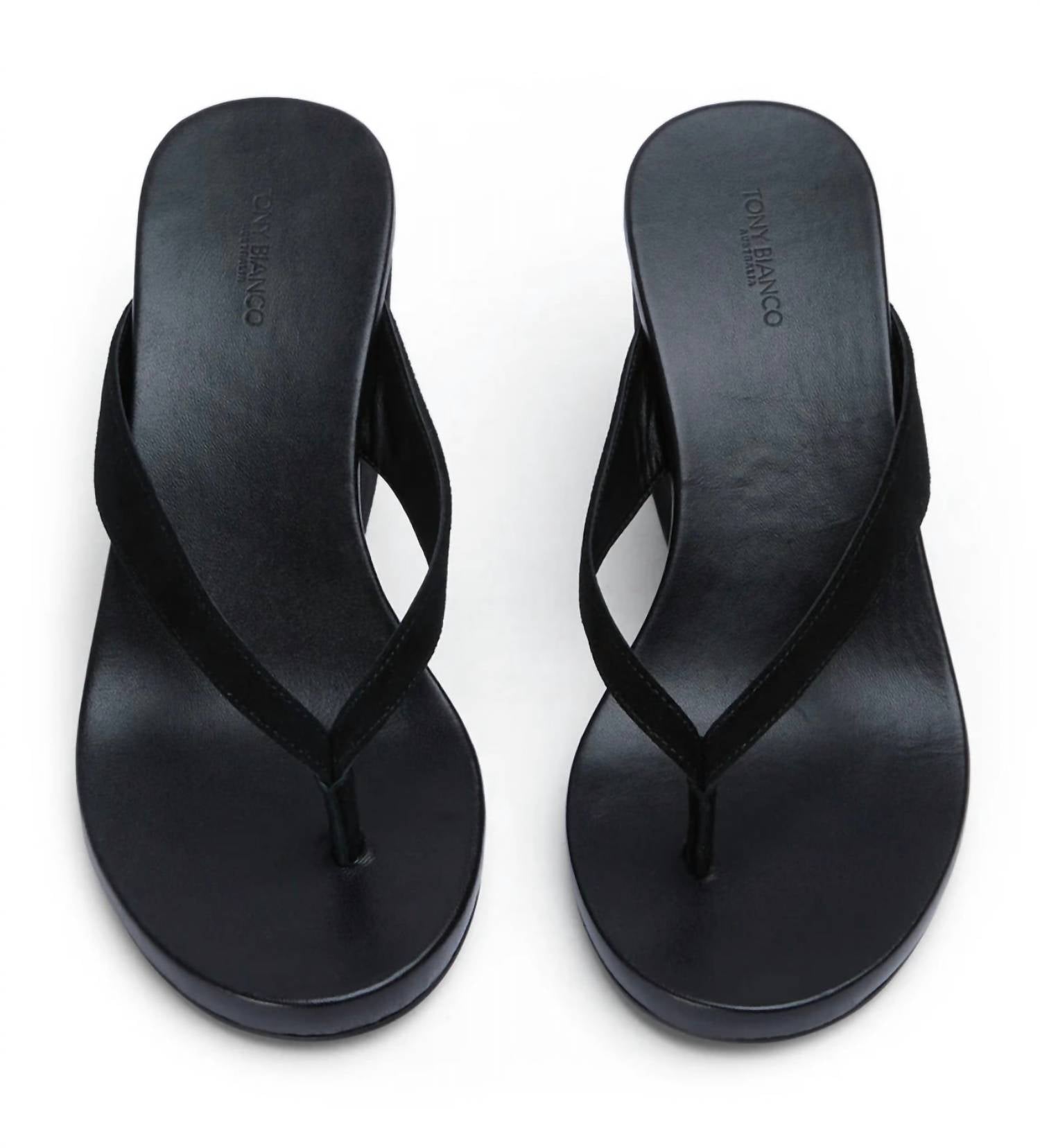 Step into effortless elegance with the Women's Avanti Suede Wedge Thong Sandals by Tony Bianco, a must-have for your summer wardrobe. Featuring a luxurious black suede composition, these sandals provide comfortable slip-on styling with a chic round open toe. The flattering wedge heel, standing at a stylish 3.35 inches (8.5 cm), complements the minimalist trend perfectly, seamlessly transitioning from beach days to evening events. Crafted for adult women, the sandals offer a true-to-size fit in medium width, ensuring a sophisticated and comfortable wear.