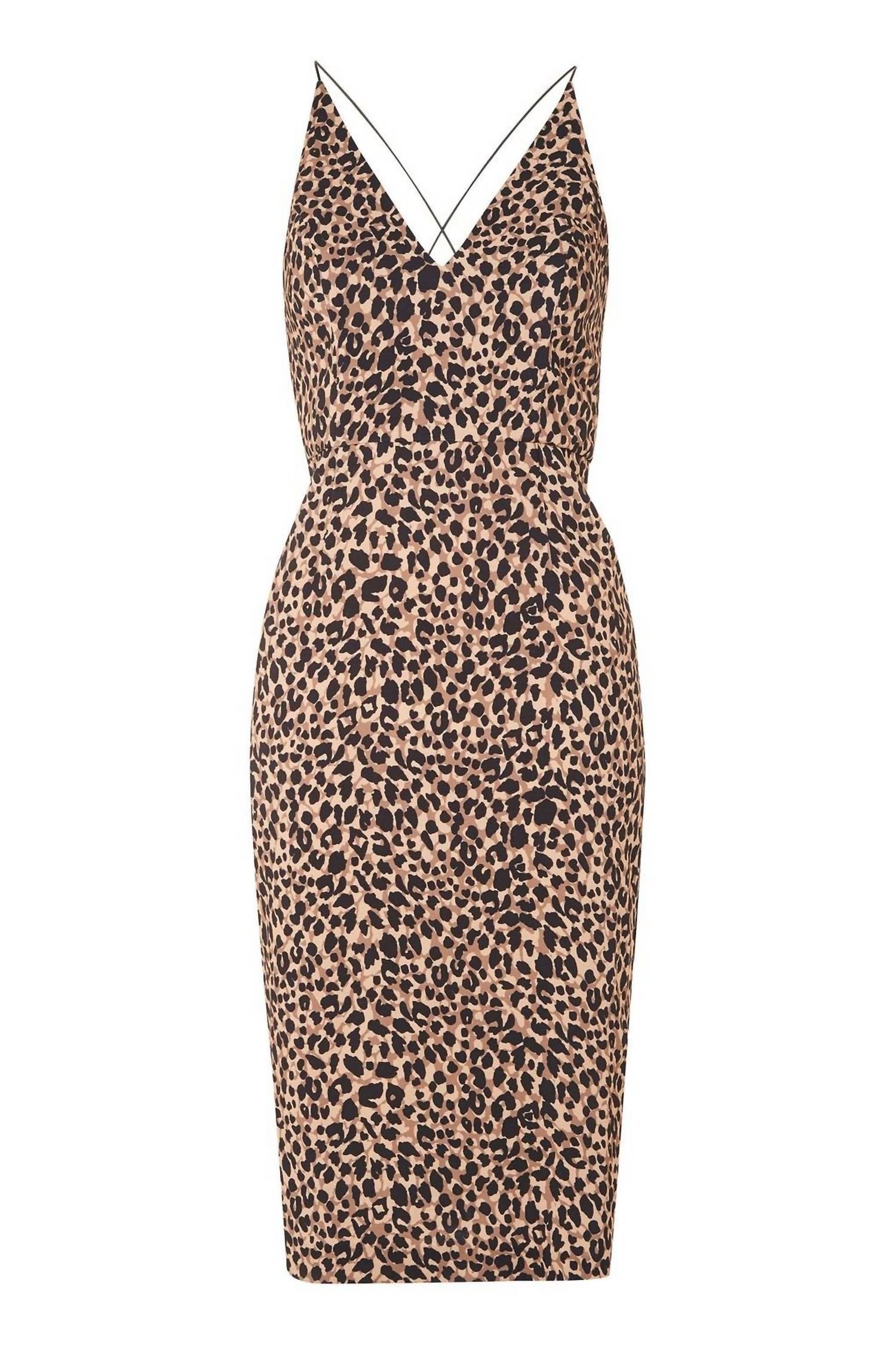 A midi dress so versatile, your options for wearing it are endless. This '90s-inspired stretch-crepe body-con dress has a provocative plunging bodice, satiny crisscross straps and leopard spots for a wild statement. Hidden back-zip closure V-neck Spaghetti straps Partially lined 98% viscose, 2% elastane Machine wash cold, line dry Length shoulder to hem 42"