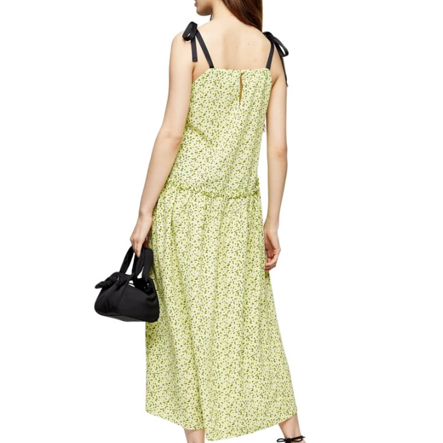 The perfect length dress does exist. Channel your inner vintage-chic with the Topshop Floral Print Sleeveless Midi Dress in a vibrant lime hue. Crafted from 100% polyester, this dress boasts a trendy square neckline and flowy silhouette perfect for music festivals. It features adjustable tie shoulder straps and practical pockets, ensuring both style and convenience. For easy wear, it includes a button closure at the back and is machine washable.