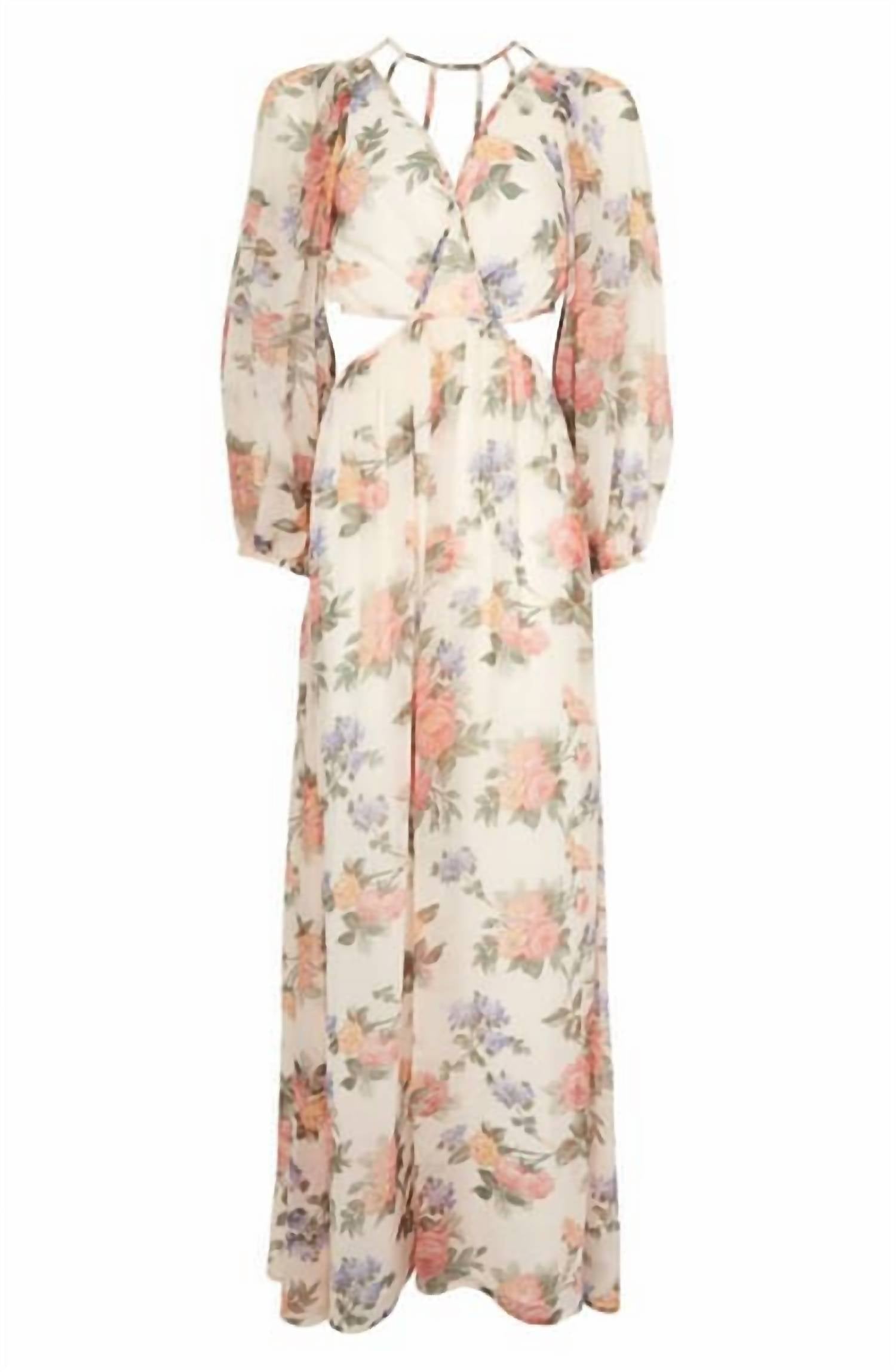 Who doesn't love a good maxi dress? This one you'll be reaching for season after season. Float on, you modern Mother Nature, in this cutout and strap-detailed maxi dress made of gossamer crinkly chiffon covered in pale roses Hidden back-zip and tie closure V-neck with strap detail Puffed three-quarter sleeves with elastic cuffs Lined 100% Polyester Machine Wash Warm Line Dry Length 56"