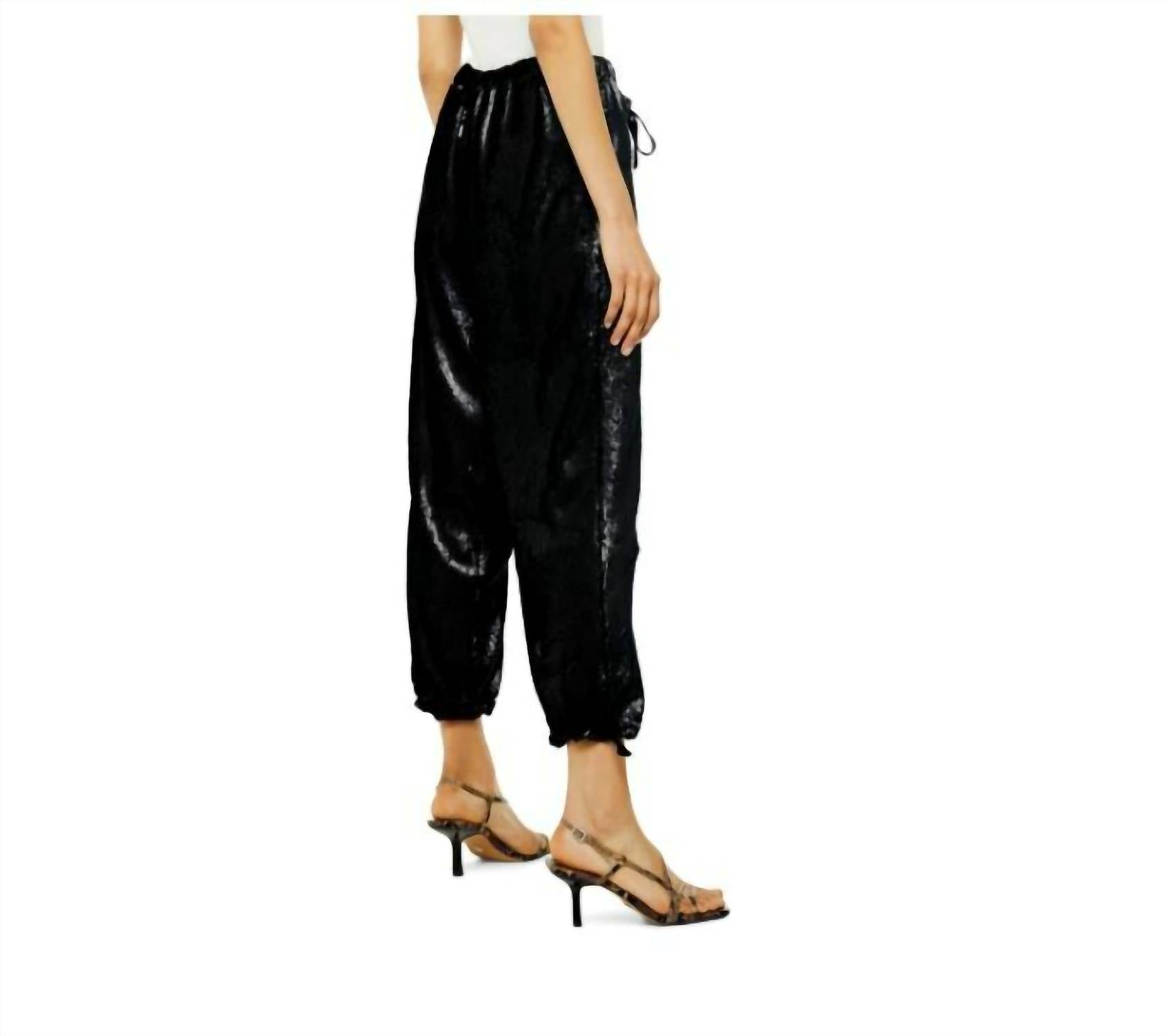 Unveil endless night-out allure with TOPSHOP's Black Sequin Crop Jogger Pants. These high-rise pants, composed entirely of dazzling 100% polyester sequins, feature a chic cropped inseam of 24", offering both comfort and style. The tie closure and stretch waist ensure a perfect fit, while the lined design boasts front and back rises of 15" each for a flattering silhouette. Ideally cared for with options of dry cleaning or machine wash, line dry.