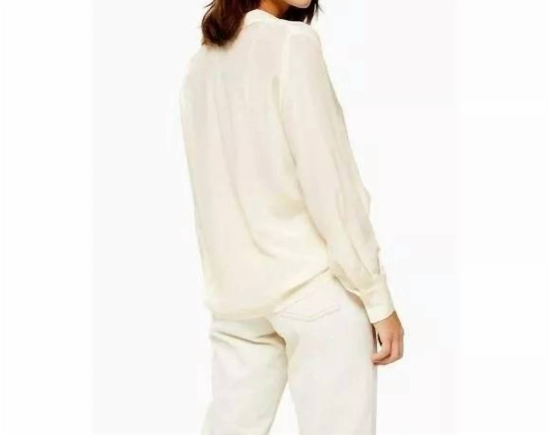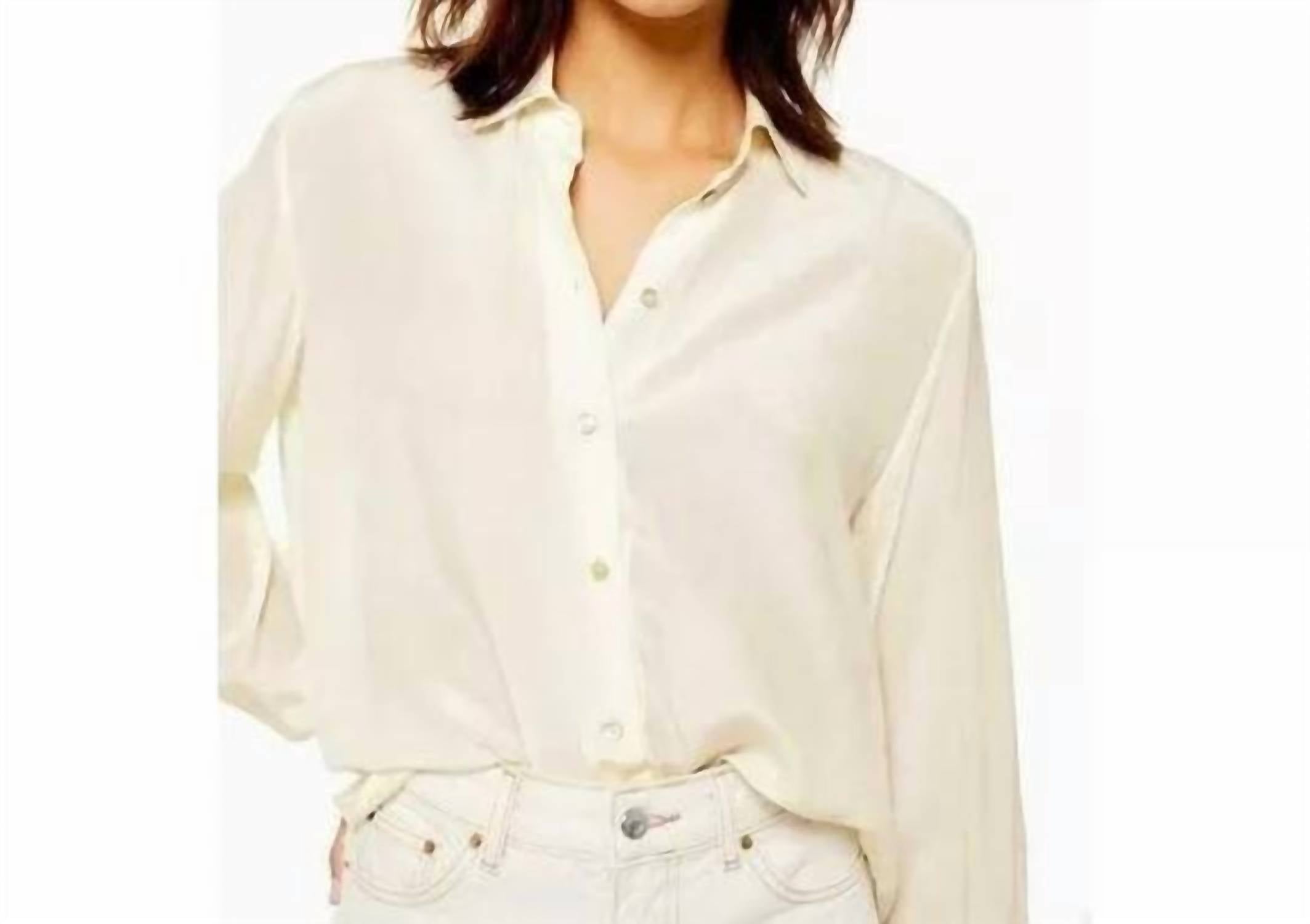 A versatile blouse that works from desk to dinner! Pole Situation Ivory Silk Button Down Blouse An oversized, menswear-inspired shirt is updated in pure silk for a luxe look and feel. Front button closure Spread collar Long sleeves 100% silk Machine wash, dry flat Length 28"