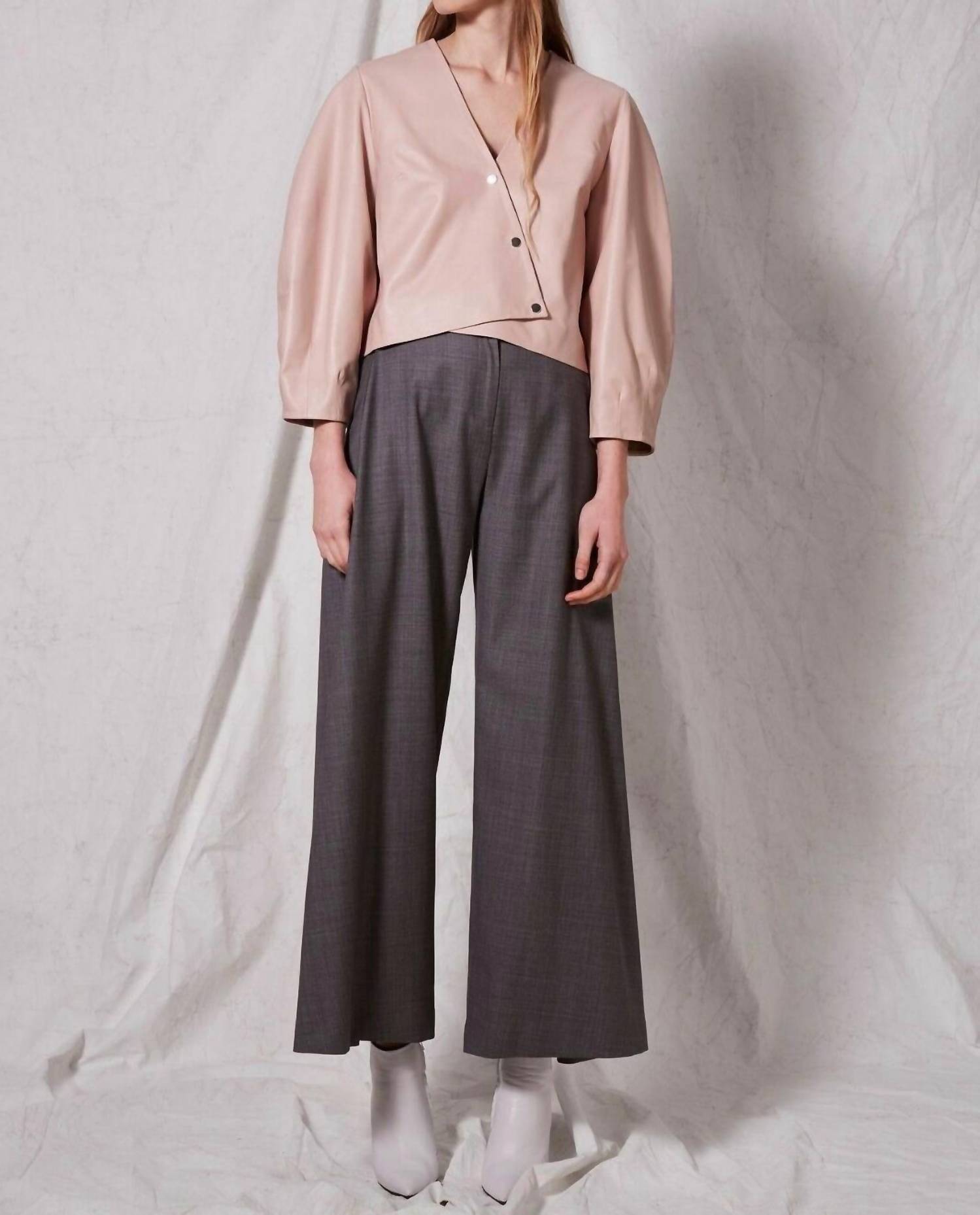 Everyone needs a leather jacket like this in their closet. The volume sleeve is an essential shape of the season. The leather wrap top channels the look in a modern, contemporary way. Try wearing it with wide-leg pants and minimal jewellery. 100% Leather. Fully lined Snap on closure Length shoulder to hem 20"