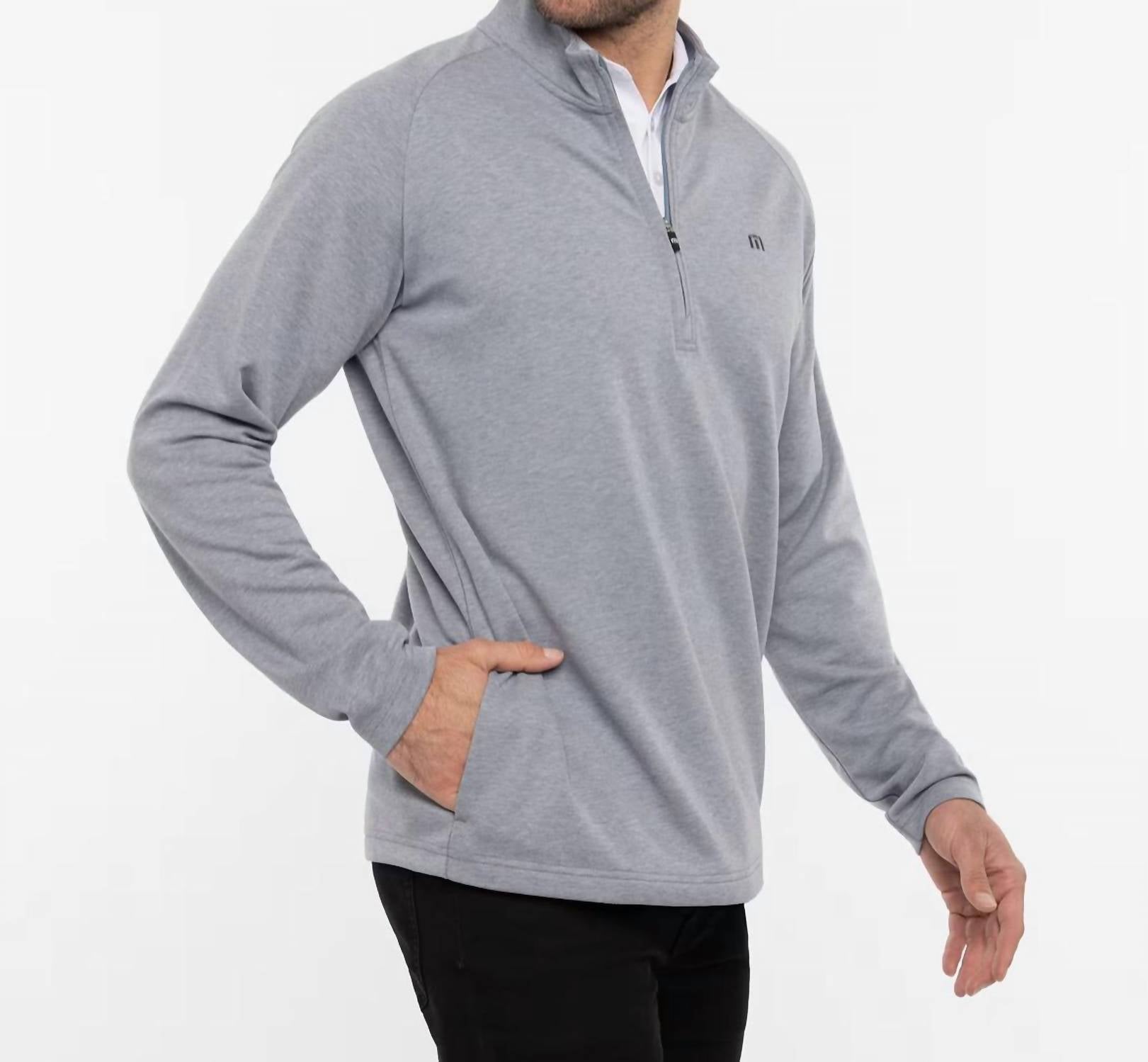 Elevate your style with the TravisMathew Upgraded Quarter Zip Jacket in Heather Grey, designed for both on and off the course. This jacket features long sleeves and is crafted from a polyester and cotton blend with a midweight lifestyle performance fabric. It includes a sleek zip closure and sports the signature TravisMathew logo on the back yoke. Made with imported materials, this versatile piece is a staple for any wardrobe. Models featured are an average of 6'1", 180 lbs seen wearing a size M.