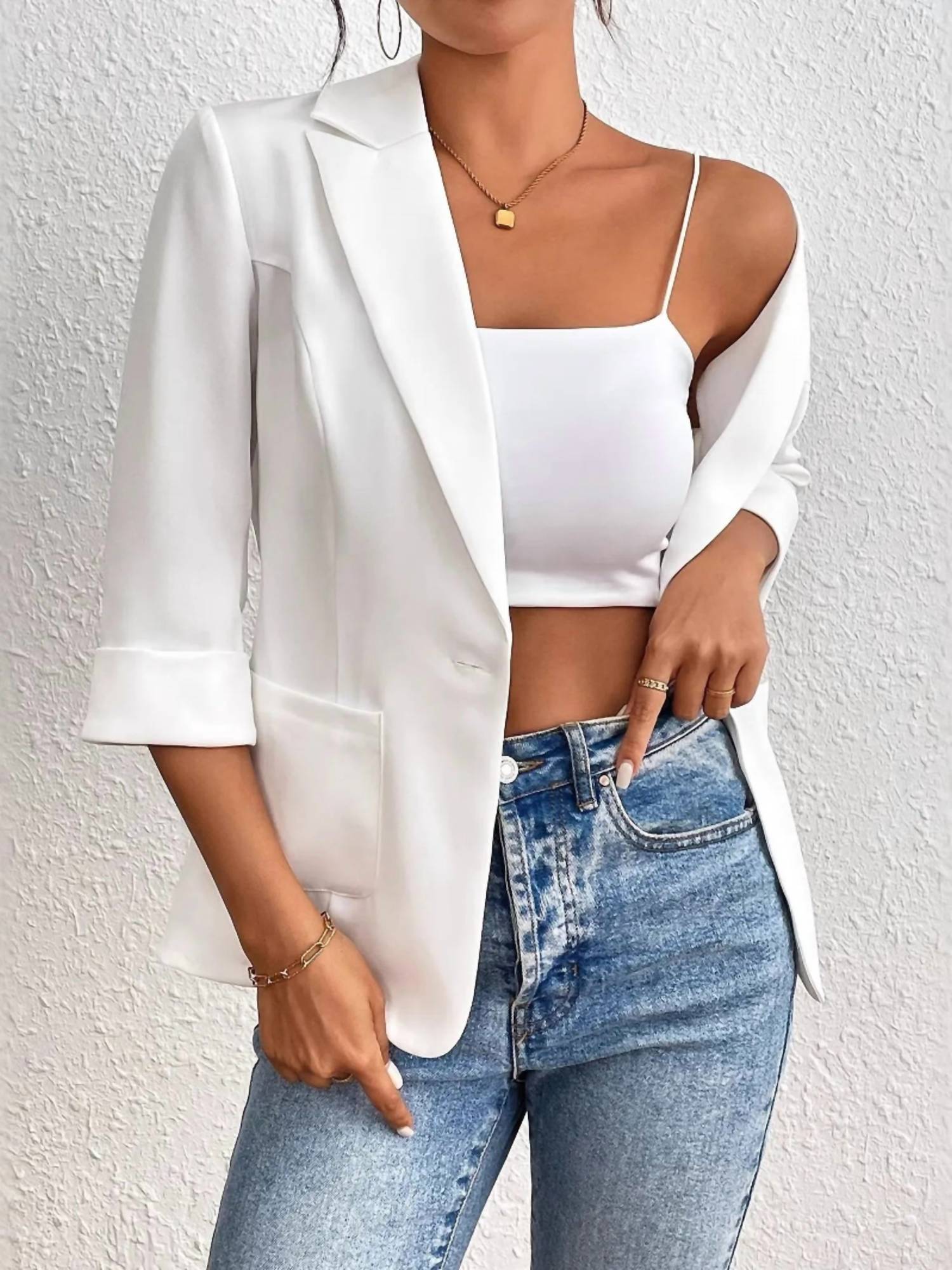 Tailored to perfection, this blazer will be your go-to jacket for years to come. Introducing the Classic Lapel Collar One Button Blazer by Trendsi, a sophisticated addition to your spring wardrobe in timeless white. This blazer is crafted from 100% polyester and features a basic, pocketed style with elbow-length sleeves. Imported with a normal thickness and without lining, it's easy to care for with machine washing and low tumble drying. Available in sizes from S to 2XL, it offers top lengths ranging from 25.6 to 27.2 inches and bust measurements from 37.8 to 46.5 inches.