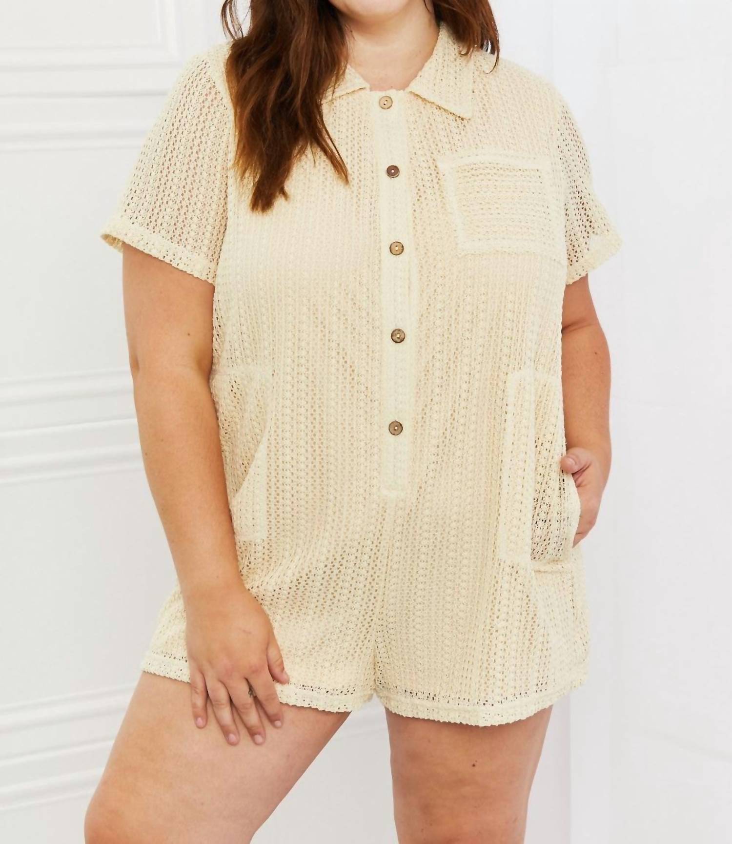The perfect outfit choice when you you need something quick to throw on and still want to look efforlessly cool. Step into style with the Heyson Ready For The Day Crochet Romper by Trendsi, designed for the modern woman. This chic romper features short sleeves, composed of 65% polyester and 35% rayon, available in a solid beige pattern. With a flattering short length, it boasts a collared neckline and incorporates a breezy look with an openwork design. Imported and equipped with convenient side pockets, this romper is finalized with a practical button closure and can be machine washed cold and tumble dried low for effortless care. Model sizes range from S to 3XL, with bust measurements between 42" and 56" and lengths from 30" to 35".