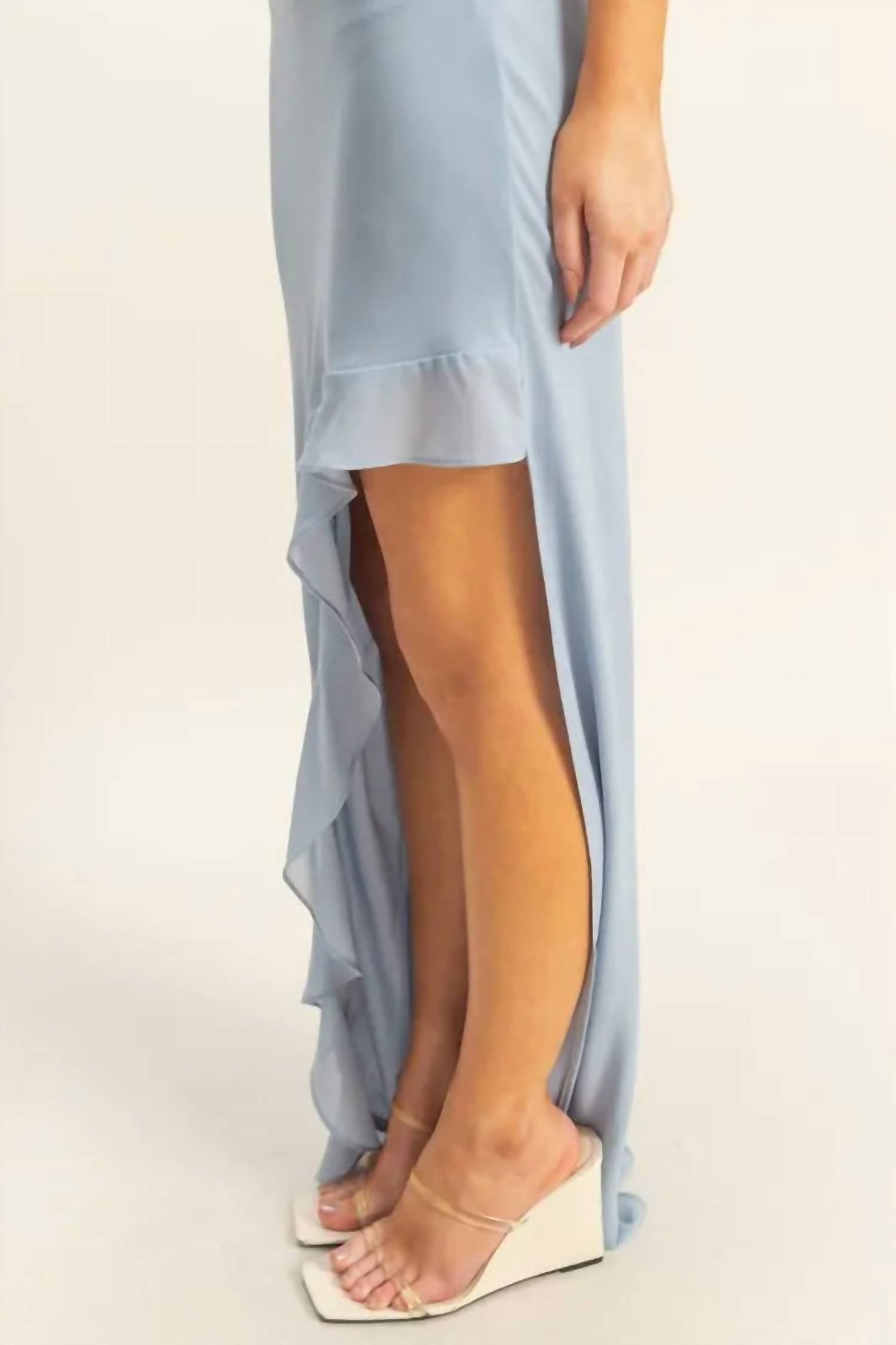 Make a statement with the Hyfve Chiffon Ruffle Trim Midi Dress by Trendsi, a must-have in Dusty Blue for a sophisticated look. This sleeveless sheath dress is made from 100% polyester, offering an airy and elegant vibe with its feminine ruffle trim. The midi length and high-low detail create a chic silhouette, perfect for spring weddings and special occasions. Closure: Pull-on style. Care instructions: Machine wash cold, tumble dry low. Available sizes: S (Bust 34-36 in, Waist 26-28 in, Hip 36-38 in), M (Bust 37-38 in, Waist 29-31 in, Hip 39-41 in), L (Bust 39-40 in, Waist 32-33 in, Hip 42-43 in). Imported.