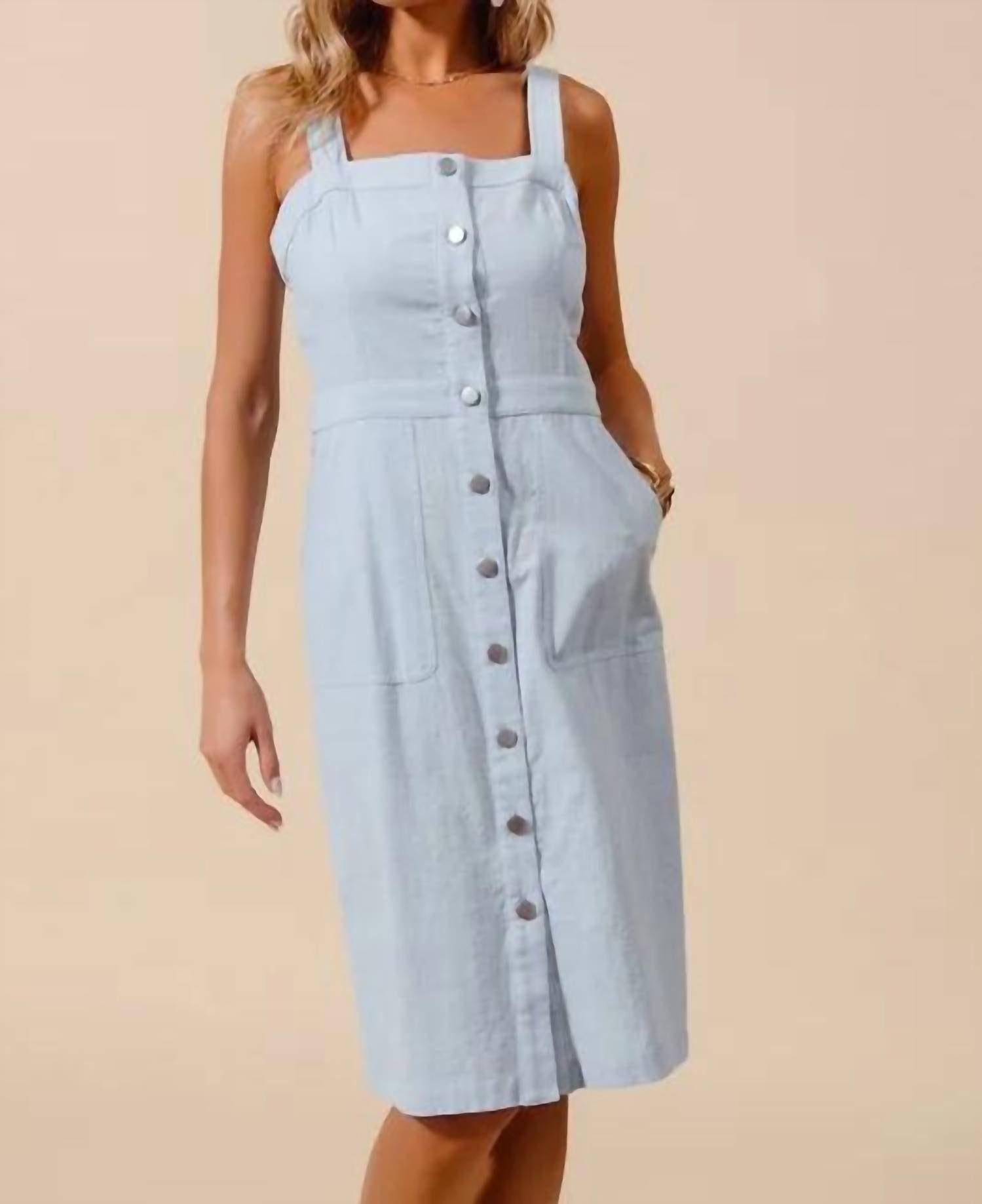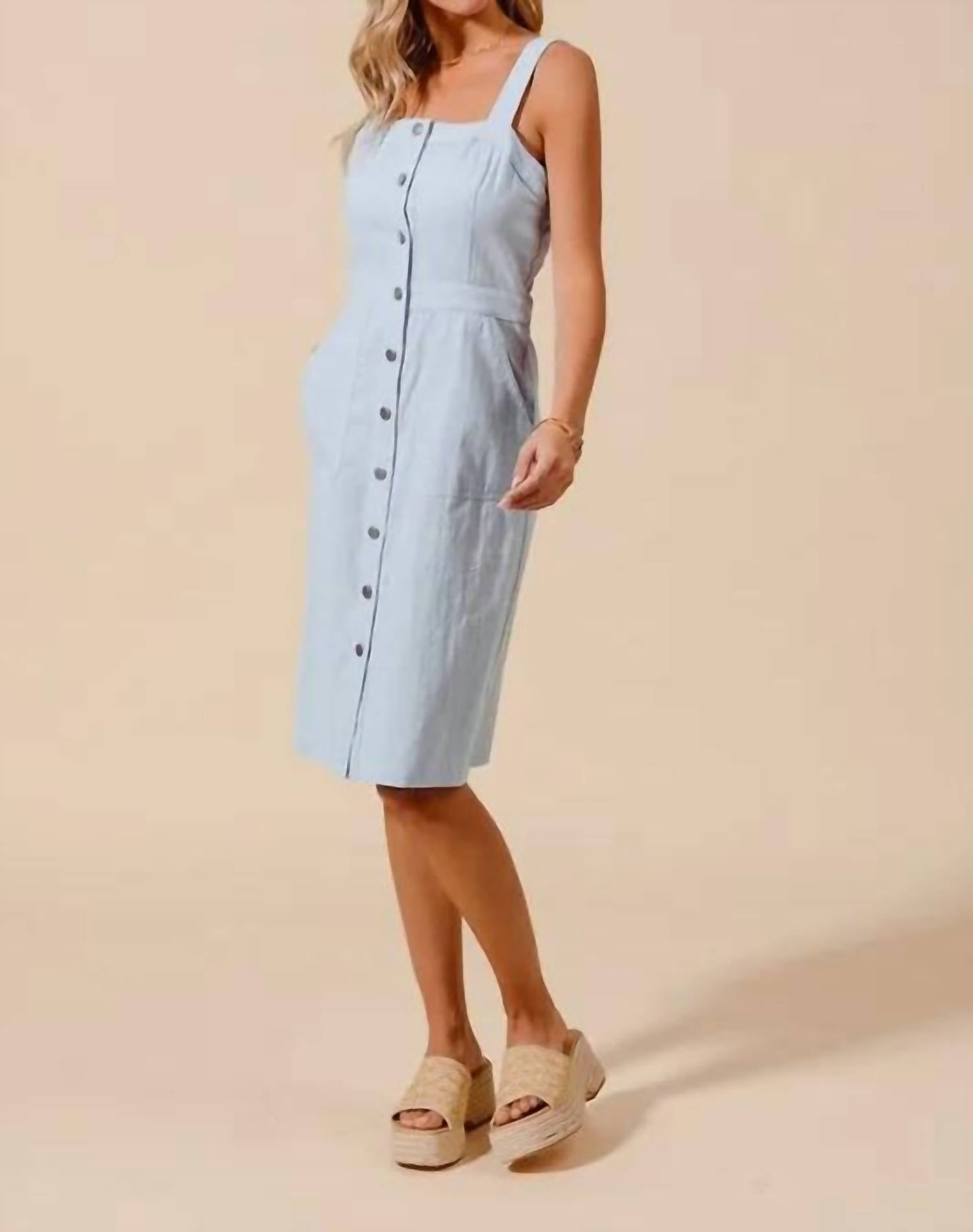 Discover the So Me Button Down Pocket Front Pinafore Dress by Trendsi, a chic mini dress in Light Denim perfect for layering. This sleeveless A-line silhouette features a button closure and practical pockets, with a solid pattern for versatile styling. Crafted from 100% cotton, it's imported and offers a classic squareneck design, making it a delightful option for any spring occasion. Care is easy with machine wash cold and tumble dry low instructions. Available sizes: S (Bust 34-36 in, Waist 26-28 in, Hip 36-38 in), M (Bust 37-38 in, Waist 29-31 in, Hip 39-41 in), L (Bust 39-40 in, Waist 32-33 in, Hip 42-43 in).