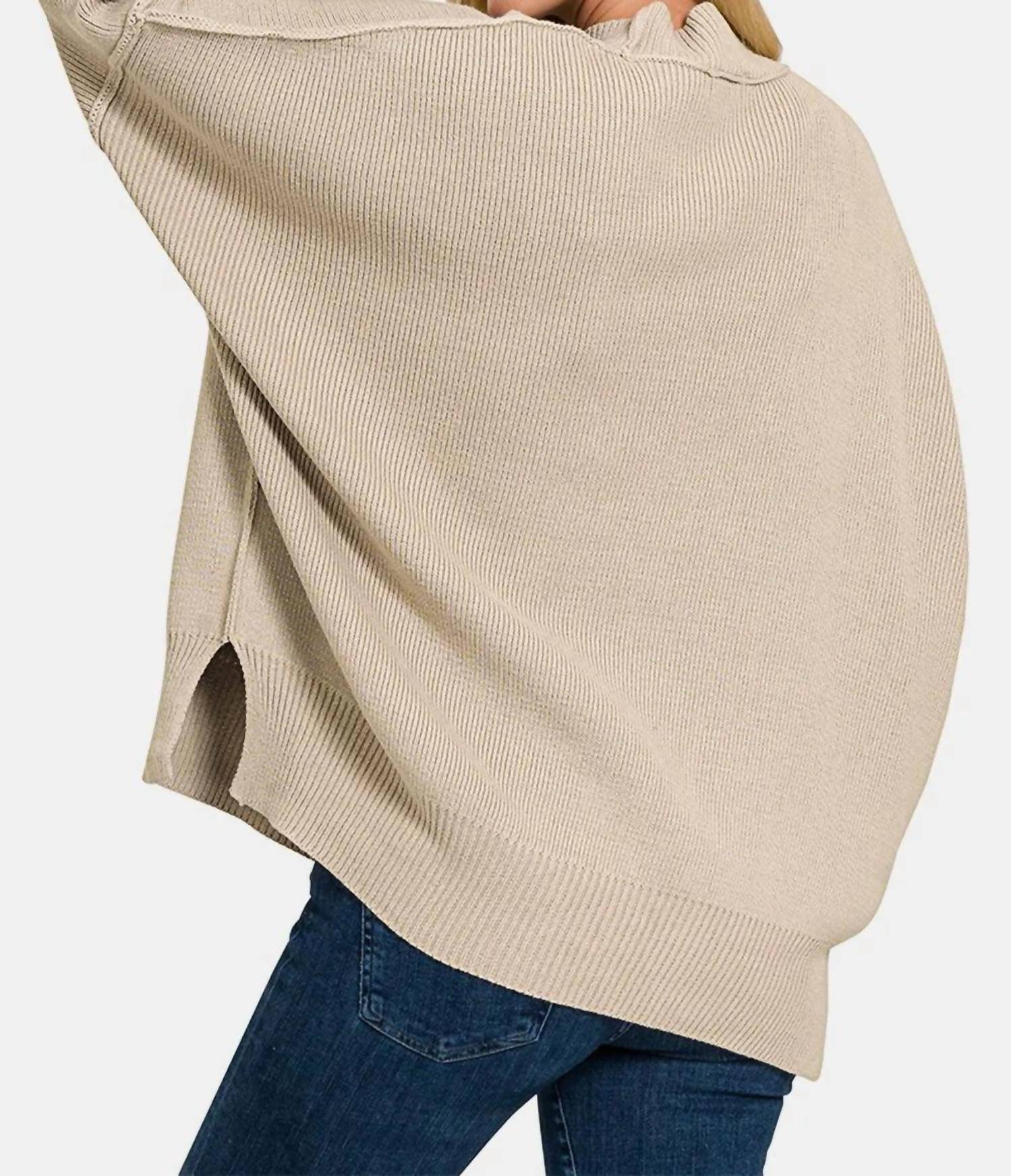 The Zenana Side Slit Oversize Sweater by Trendsi is the ultimate blend of style and comfort, ideal for your casual wardrobe in a chic beige shade. This long-sleeve sweater features a mockneck and ribbed design with stylish side slits and exposed seams for added flair. Crafted from 56% cotton, 38% acrylic, and 6% nylon, it is slightly stretchy and ensures warmth for spring travel occasions. It is imported and designed for easy care with a pull-on closure, machine wash cold, and tumble dry low. Available in sizes S/M with a bust of 34-38 inches and L/XL with a bust of 39-42 inches.