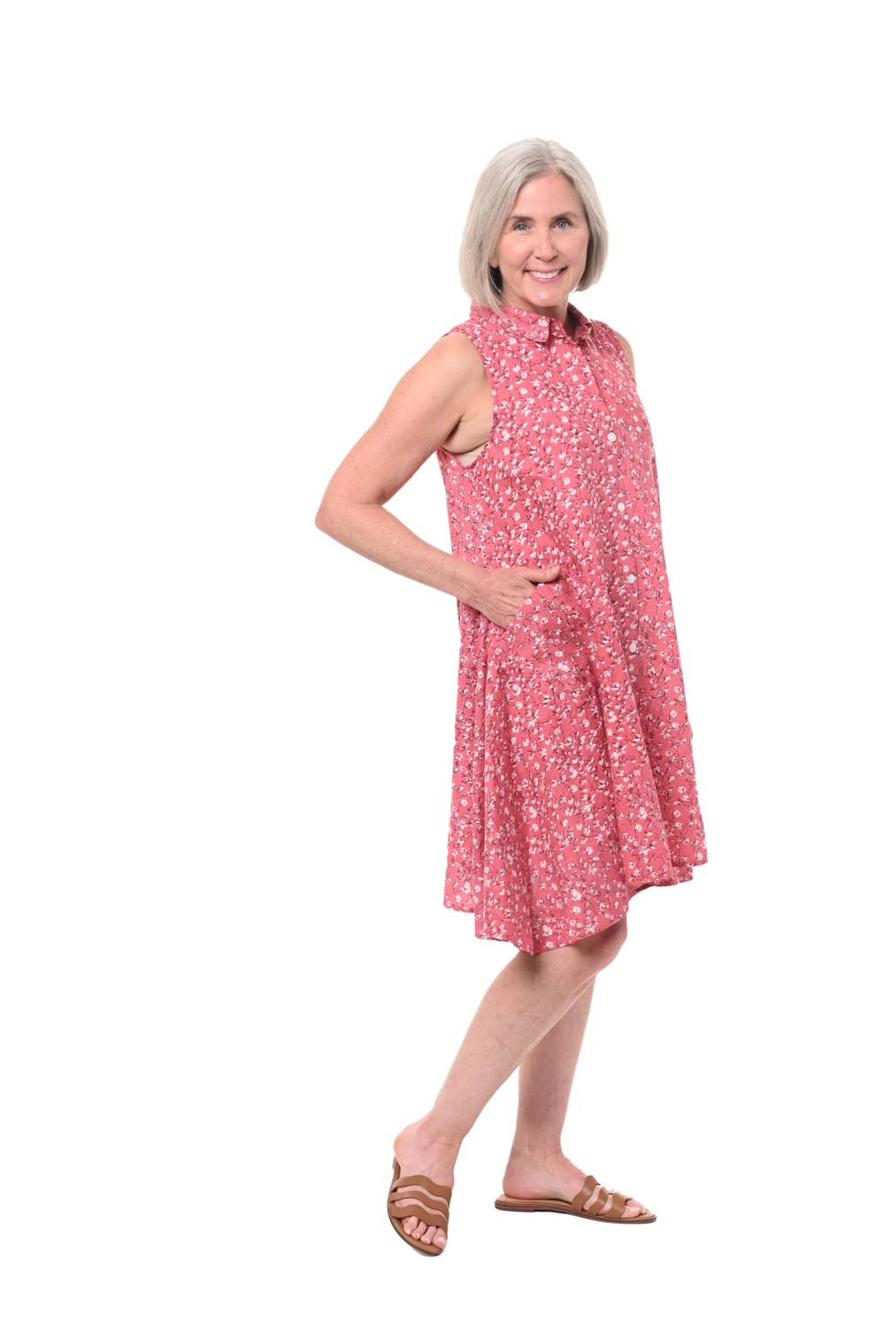 The perfect length dress does exist. The Bree Dress by Tulip Clothing is a chic addition in a floral Blossom pattern, ideal for a dinner party. Crafted from 100% cotton, this sleeveless, collared, swingy dress features a convenient button closure and front pockets for added functionality. The dress comes in various sizes with chest measurements ranging from XS 38" to XXL 48" and lengths from XS 35.5" to XXL 38". Care is simple with machine wash and line dry instructions. Model is wearing size small.
