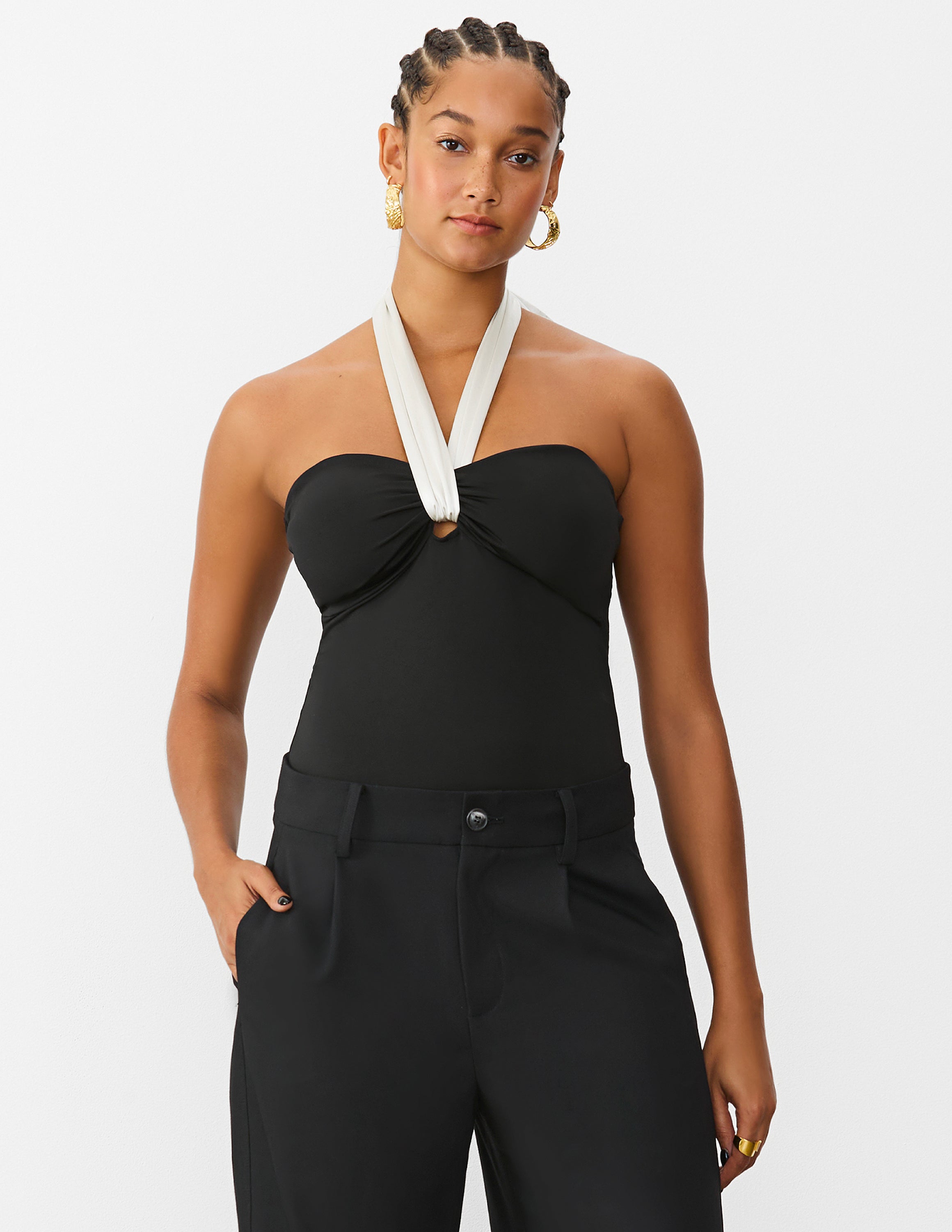 Our Twist Halter Top features a form-flattering fit with a detachable satin neck tie for versatile styling. It’s a sharp look with a playful twist.