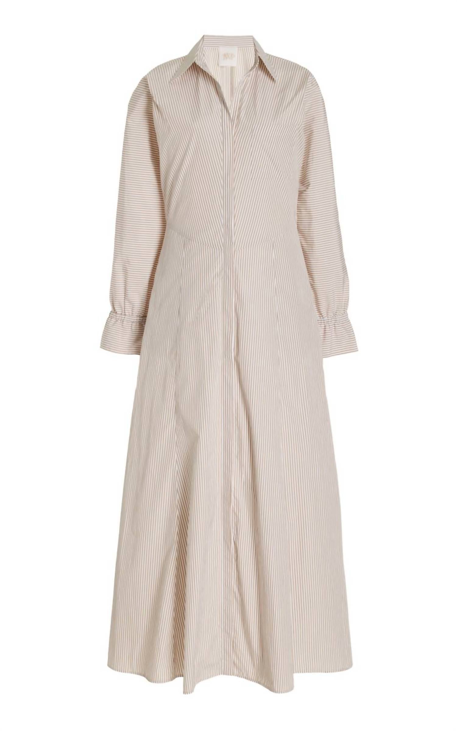 Embrace effortless elegance with the Lazy Hazy Days of Summer Dress by TWP, featuring long sleeves and a fit and flare silhouette in khaki and white pinstriped Italian cotton. This maxi dress boasts an adjustable ruching at the cuffs and a stylish collar neckline, completed with a practical chest patch pocket and button closure. Made in the USA, it's designed for a perfect fit at the waist with a subtle pleat, embodying minimalist spring trends ideal for engagements or Easter celebrations. Crafted from 100% cotton, it's convenient to care for with machine wash instructions.