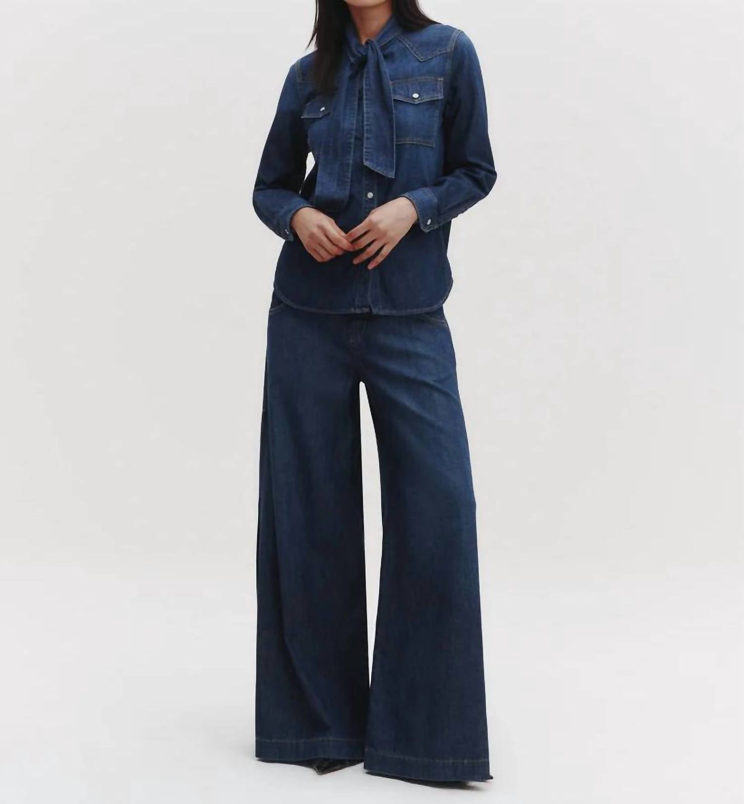 A flattering silhouette that's suprisingly versatile. Step into spring with the Lulu Jeans by TWP, designed for contemporary flair and comfort. These mid-rise wide leg pants are crafted from 100% cotton dark washed denim, providing a lightweight feel and relaxed fit perfect for the season. Additional features include dramatic wide legs, side slits, deep curved side pockets, and back welt pockets, accentuated by contrast top stitching. Button closure. Machine wash, tumble dry.