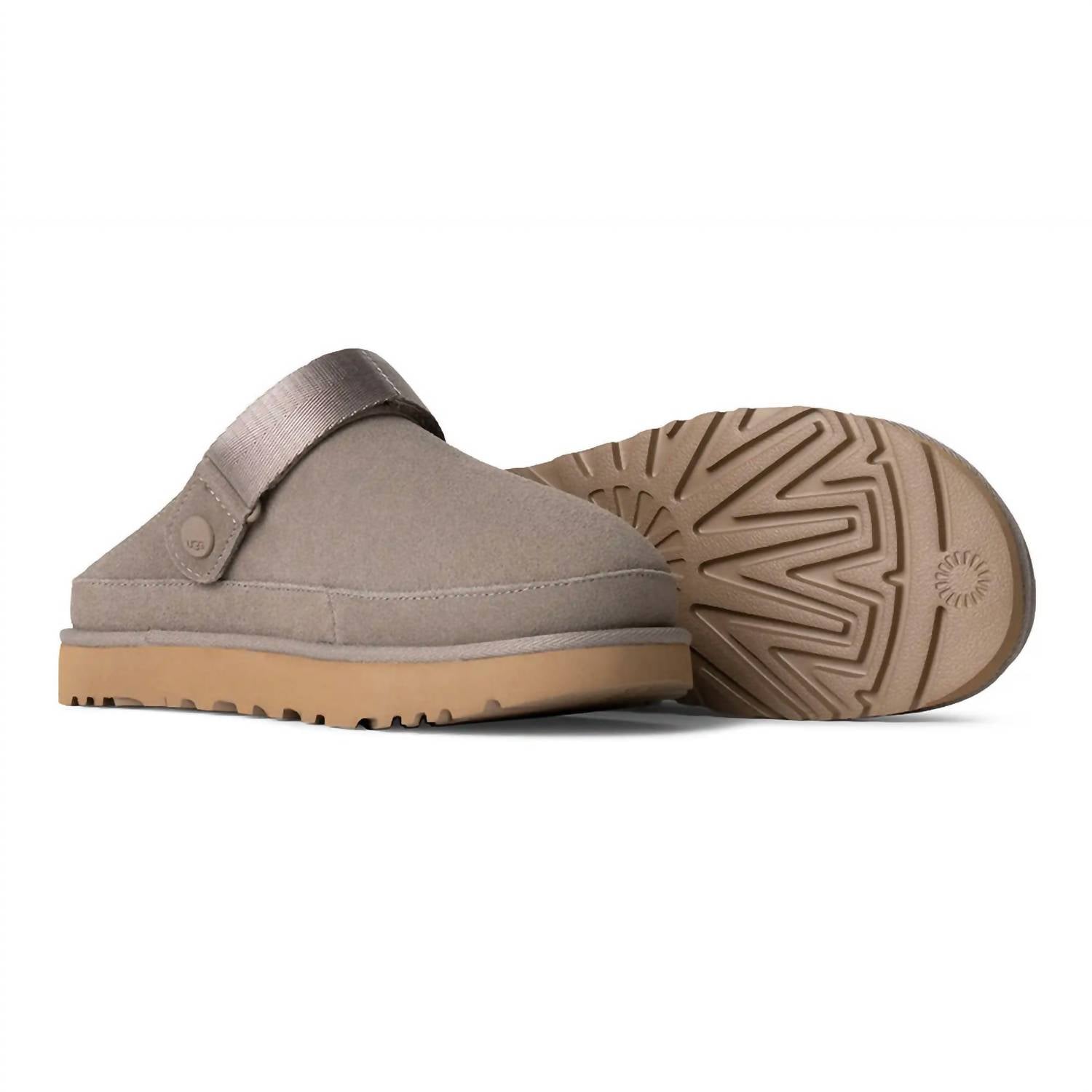 Stylish, comfy, and versatile. We can't find anything wrong with these. Step into the vibrancy of summer with the Goldenstar Clog by UGG in Smoke Plume, perfect for women embracing effortless streetwear style. Crafted from suede, this versatile flat heel clog features an innovative adjustable heel strap with a hook-and-loop closure, allowing for both an easy slip-on experience or a secure fit. Inside, a contoured EVA footbed and a sugarcane EVA outsole offer lightweight support for all-day comfort during vacations or casual outings. Celebrate the season with this stylish addition, complete with recycled polyester binding, ideal for any occasion, including the 4th of July.