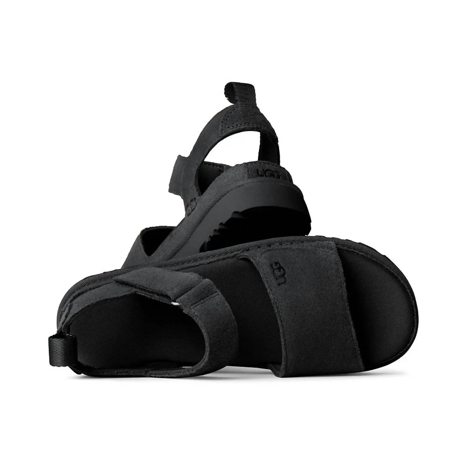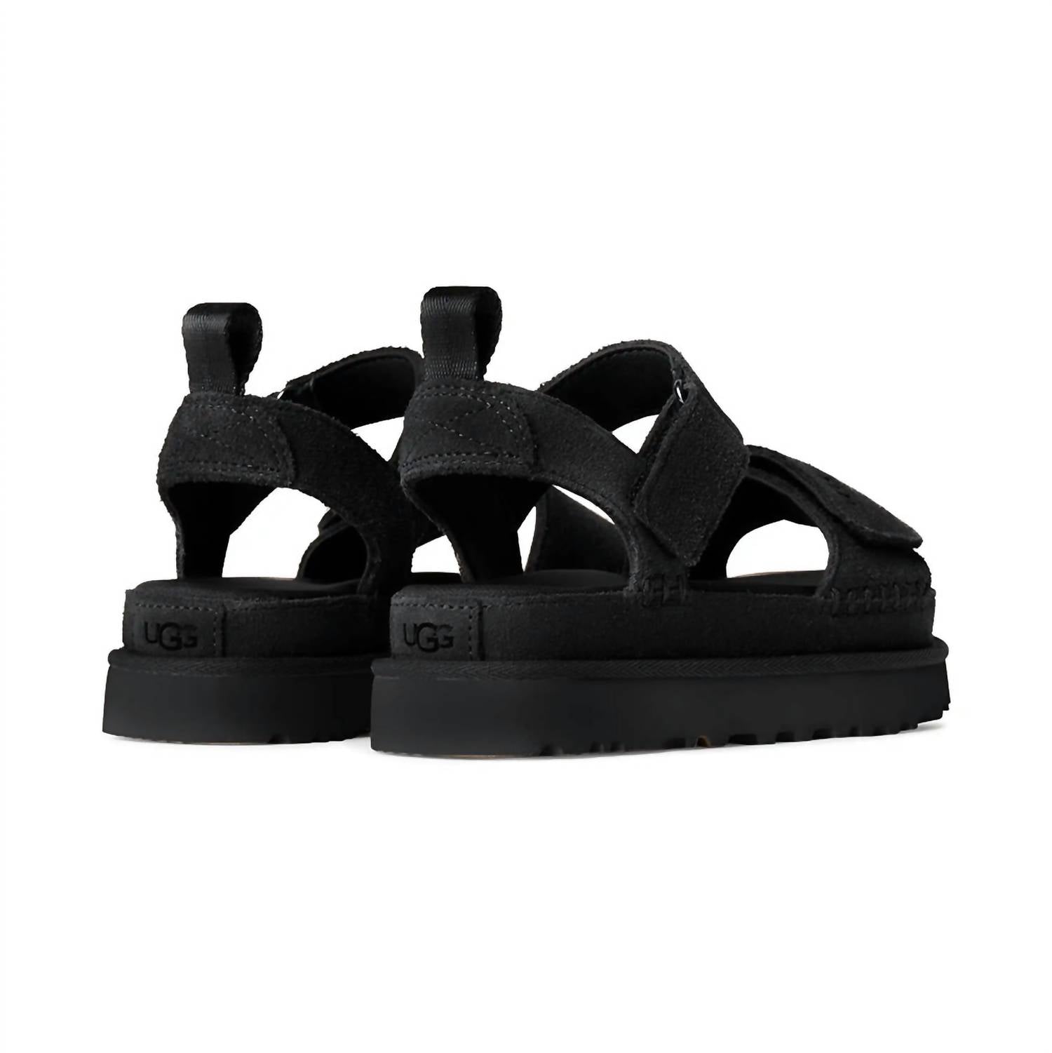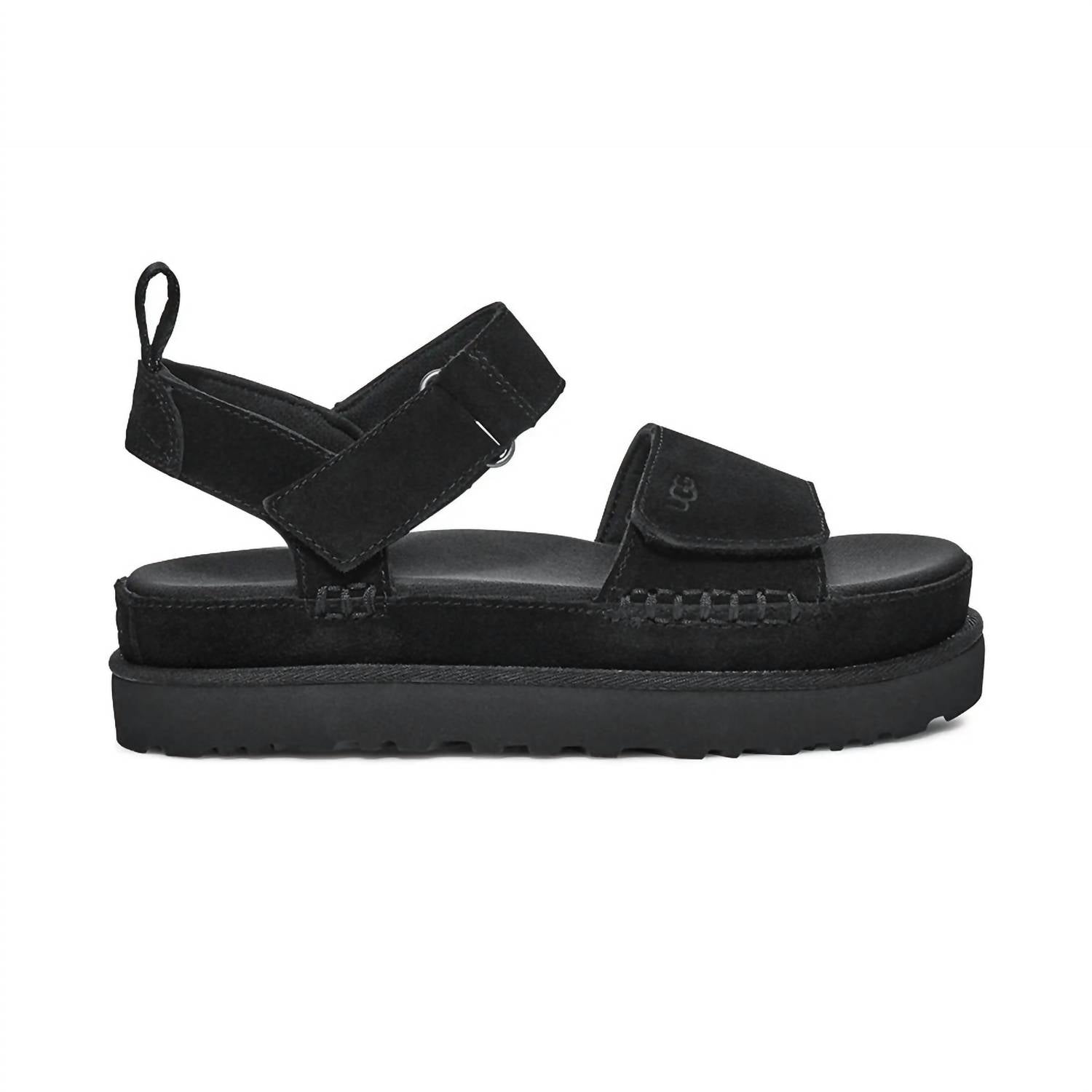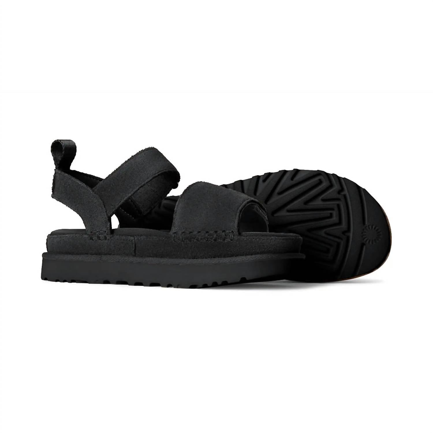 Flowy dresses, cropped pants, and even jumpsuits... this sandal works with them all! Step out in effortless comfort with the Goldenstar Sandal by UGG, featuring an open toe design crafted from high-quality leather. This black sandal for women boasts adjustable straps for a custom fit and a lightweight outsole, making it ideal for all-day wear. With a cushy foam footbed and recycled polyester binding, it offers both style and sustainability. Perfect for spring events like Easter or a casual streetwear look, this sandal seamlessly transitions from a sporty ensemble to a dressed-up minimal long dress.