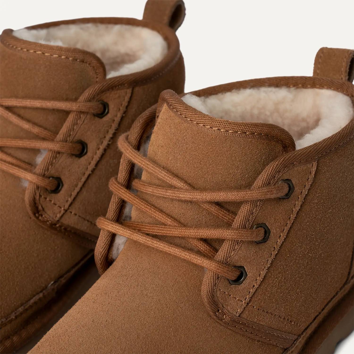 Step into style with the UGG Men's Neumel Winter Boots, crafted from rich chestnut suede for a timeless look. These chukka boots feature a 3.75" shaft height and are lined with 17mm UGGplush™, a blend of upcycled wool and TENCEL™ Lyocell for ultimate comfort, while the responsible sugarcane EVA outsole or Treadlite by UGG™ EVA outsole provides durable cushioning. With a rear pull tab and metal eyelets along with cotton laces, these boots offer easy wearability. Perfect for winter travels and inspired by 90s fashion, they are a flat style ideally suited for both indoor and outdoor use.
