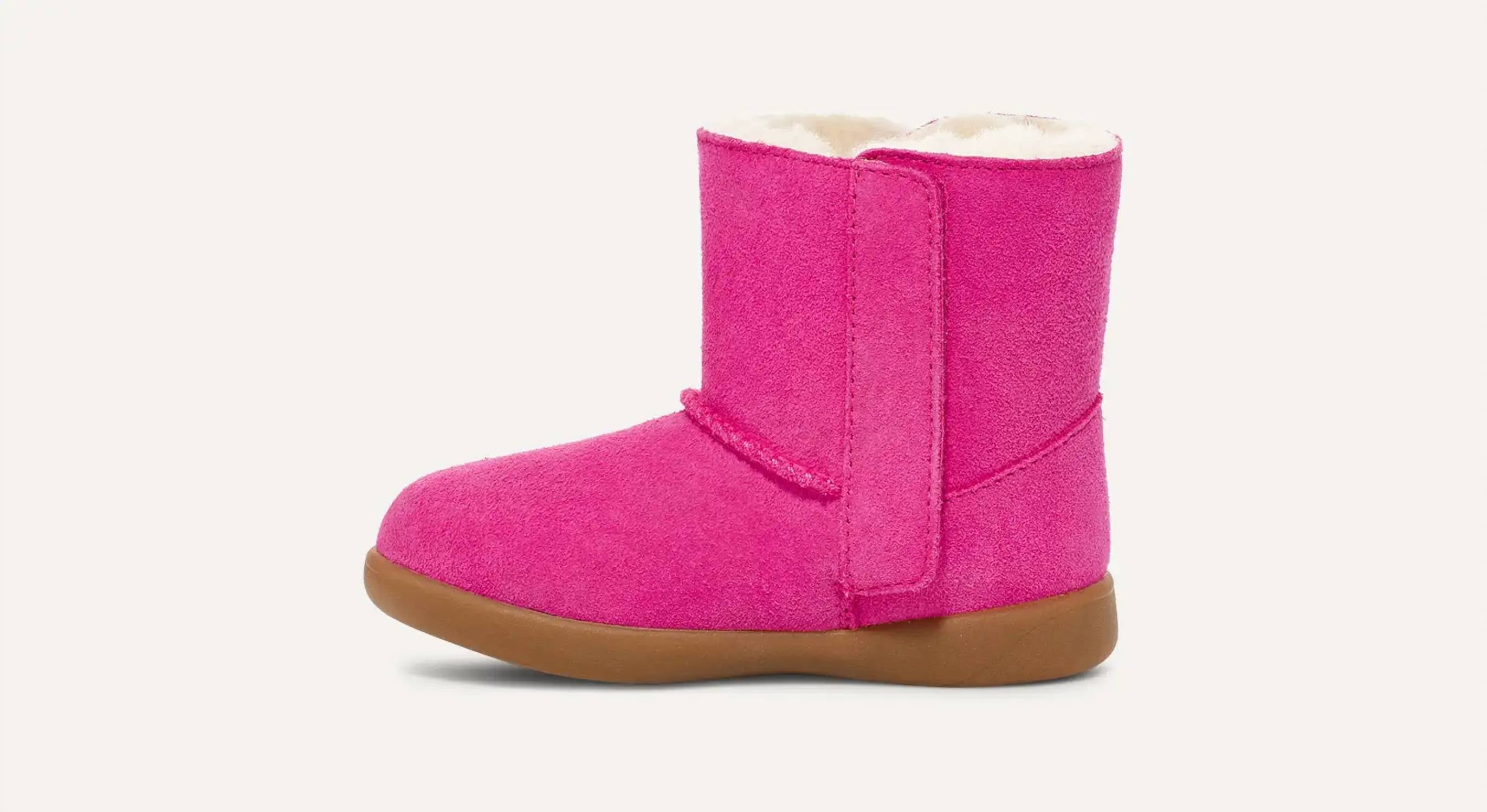 The Toddler Keelan II Boot by UGG in vibrant Rock Rose hue is crafted for optimal comfort and style. Featuring a soft suede upper, this boot has a convenient hook-and-loop closure for easy wear. It is lined with 10mm UGGplush™, a blend of 60% upcycled wool and 40% TENCEL™ Lyocell, offering eco-friendly warmth and comfort. The molded rubber outsole, containing 30% recycled materials, ensures improved traction and durability, perfect for active toddlers.