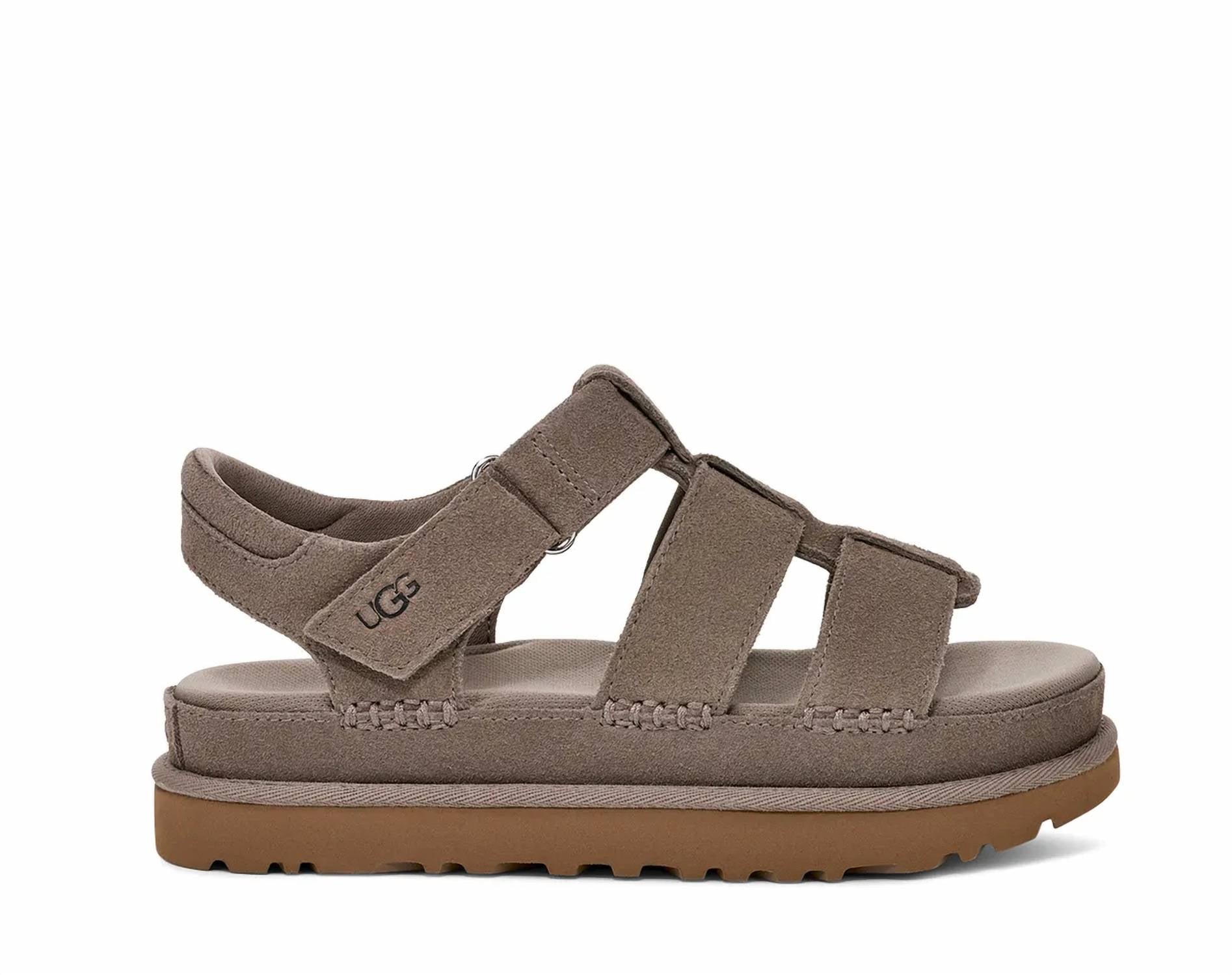 Classicly cute and all-day-wearable. We love this sandal. You are a star. This is the Goldenstar. It's a match made in warm weather heaven. This is the sandal that feels like the Classic UGG Boot. Crafted from velvety suede and made with an ultra-cush but supportive foam footbed and a lightweight outsole for all-day wear. An adjustable strap provides a fine-tuned fit for comfortable days on the go. Go ahead, join the Goldenstar fan club. This product was made in a factory that supports women in our supply chain with the help of HERproject. This collaborative initiative creates partnerships with brands like ours to empower and educate women in the workplace. * Suede upper * Adjustable ankle strap, Hook-and-loop closure * Textile lining made from 100% recycled polyester fibers, Microfiber lining * Sockliner textile made with 100% recycled polyester, Sockliner incorporates peppermint-based anti-odor treatment * Contoured EVA footbed * Sugarcane EVA midsole made with recycled EVA regrind * Sugarcane EVA outsole * Recycled polyester binding * The UGG® logo, heat-embossed