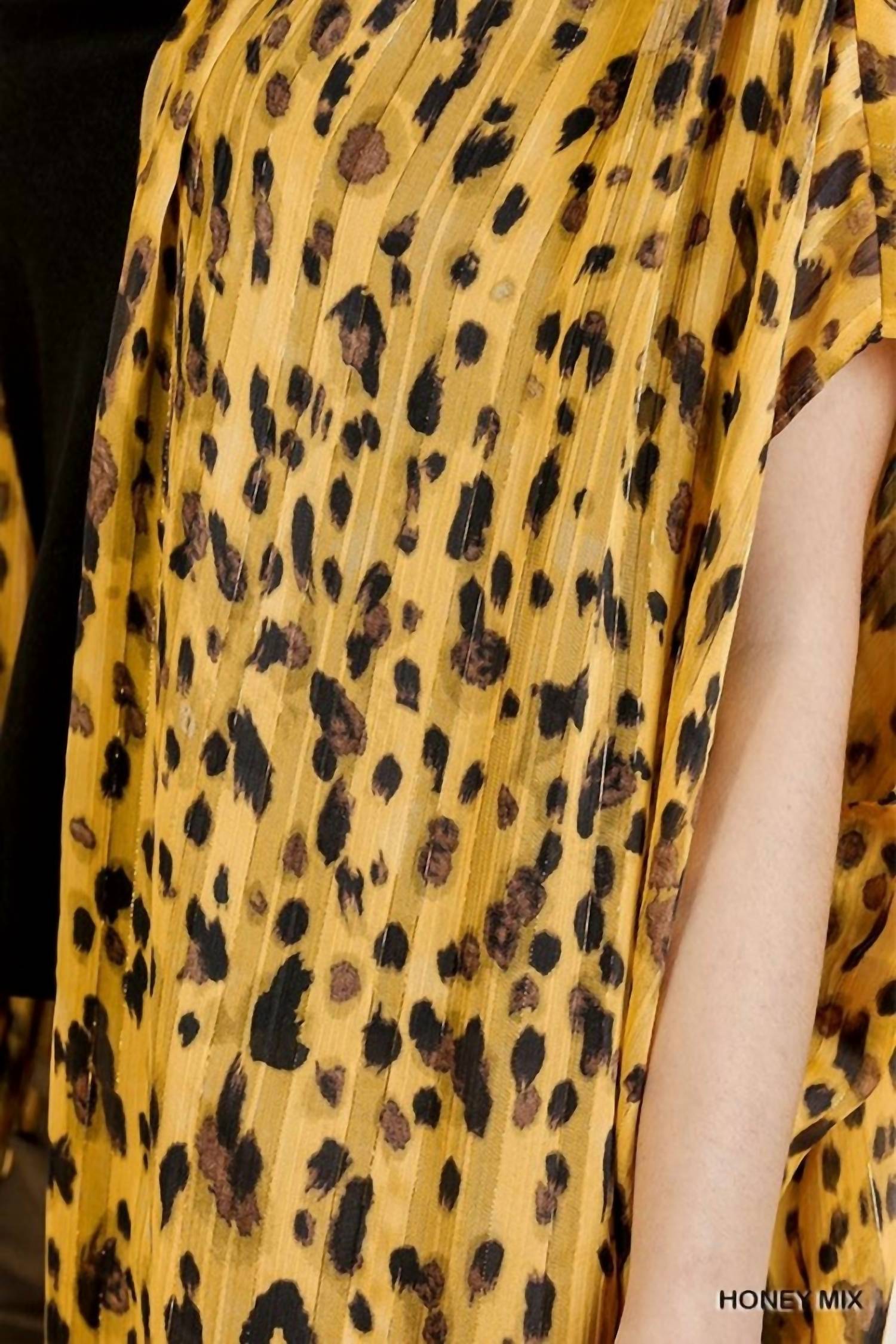 Pair this with your favorite jeans and slides for your next girls night out. Embrace effortless style with the Umgee Animal Print Cocoon Kimono in a chic Honey Mix. This piece features short sleeves and a relaxed fit, making it an ideal layering option. Crafted from 97% polyester and 3% metallic, it offers lightweight comfort with a pull-on closure. Care for this item with dry cleaning to maintain its vibrant look. Model is 5'9", wearing size S/M, while the plus model is also 5'9" in size XL/1XL.