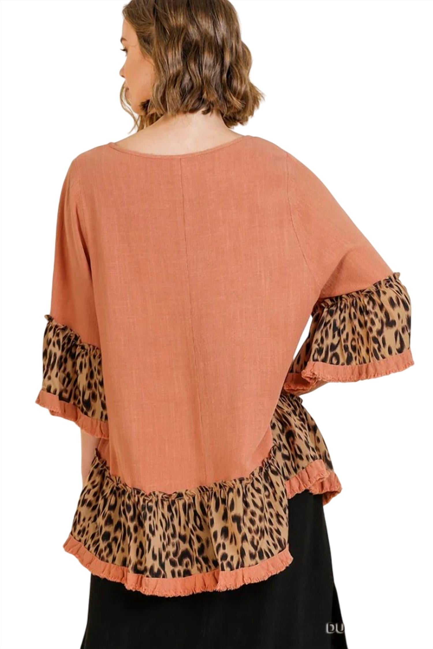Embrace playful elegance with the Umgee Animal Print Ruffle Hem Top in a delightful Peach hue. This women's blouse features three-quarter bell sleeves and a boatneck neckline, creating a whimsical, full cut A-line silhouette. Crafted from a 55% Linen, 45% Cotton blend, this imported top offers a breathable and stylish fit. Closure is a convenient pull-on design, and care is easy with hand wash instructions.