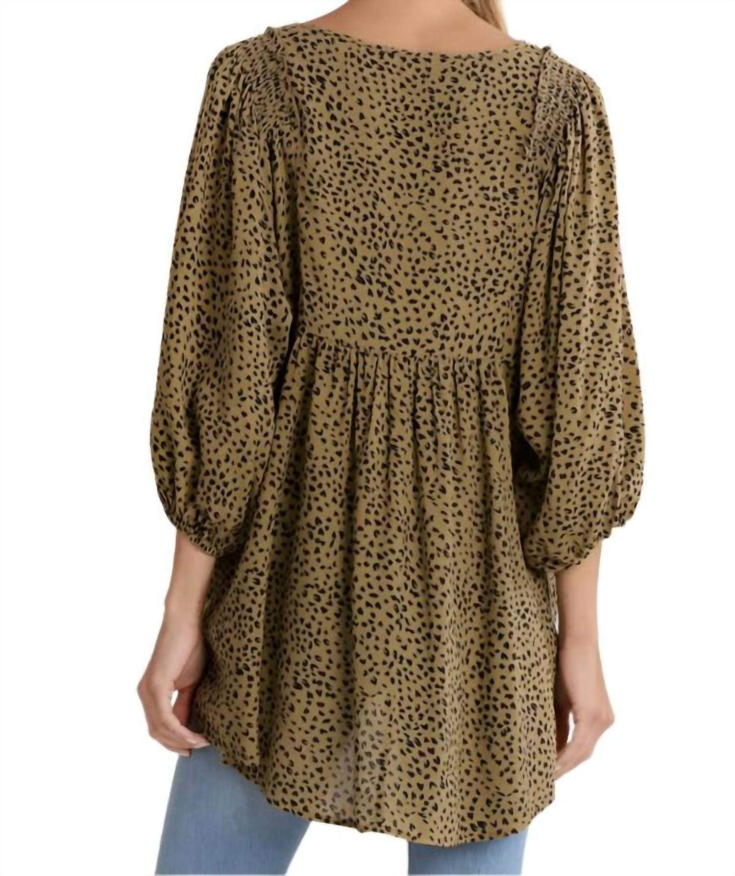 A timeless blouse that will never go out of style. Introducing the Babydoll Keyhole Blouse by Umgee, a striking toffee piece perfect for adding flair to any wardrobe. Designed with three-quarter sleeves featuring elastic cuffs, this blouse is made from lightweight 100% rayon and boasts a captivating animal print. The round neckline with keyhole, smocked shoulder detail, and high-low hemline complete the playful babydoll silhouette. Care for this imported beauty with a simple hand wash. Available dimensions are: Small Bust 40", Length 28"; Medium Bust 42", Length 28"; Large Bust 44", Length 28"; XL Bust 50", Length 30"; 1X Bust 52", Length 30"; 2X Bust 54", Length 30".