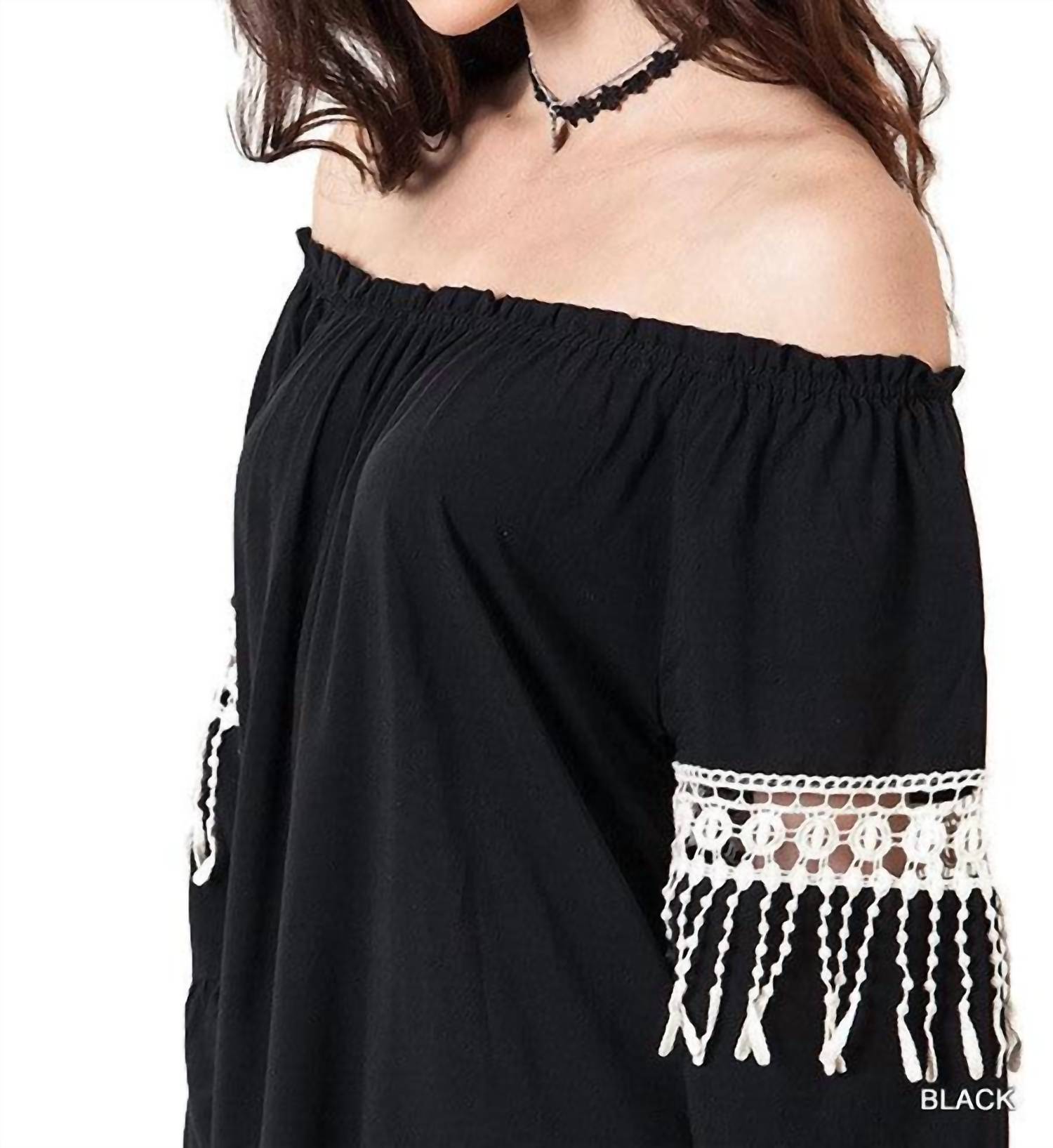 The kind of easy and flattering dress you'll be reaching for all season long. Discover effortless elegance with the Umgee Bell Sleeve Boho Chic Dress, rendered in timeless black for a look that's both fun and flirty. This mini dress features long bell sleeves adorned with crochet detailing and an off-the-shoulder neckline, enhancing its relaxed A-line silhouette. Dimensions: Small Bust 38", Medium Bust 40", Large Bust 42", XL Bust 46", 1X Bust 48", 2X Bust 50". Closure type: Pull on.