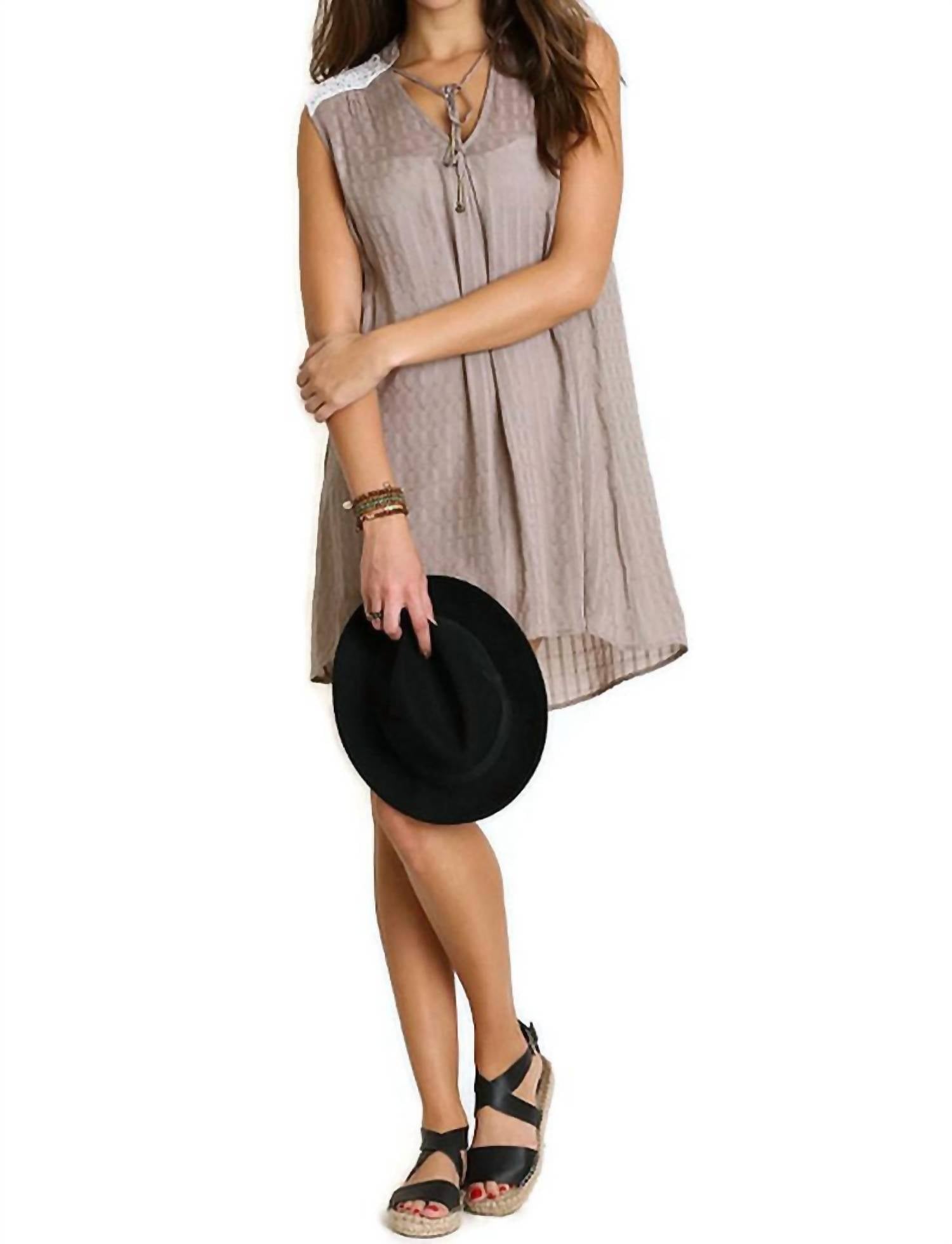 Discover the Bohemian Lace Sleeveless Dress by Umgee in a stylish Mocha hue, perfect for your summer wardrobe. This women's dress features a V-neck with a tie closure, intricate lace detailing, and a slight high-low hemline that complements its relaxed A-line silhouette. Crafted from a comfortable cotton blend (65% cotton, 35% polyester) and finished with a pull-on closure, it offers both ease and elegance. Imported and designed with a focus on quiet luxury, this mini dress is perfect for a dinner party, and care is simple with hand wash instructions. Available in Small (Bust 40", Length 34"), Medium (Bust 42", Length 34"), and Large (Bust 44", Length 34").