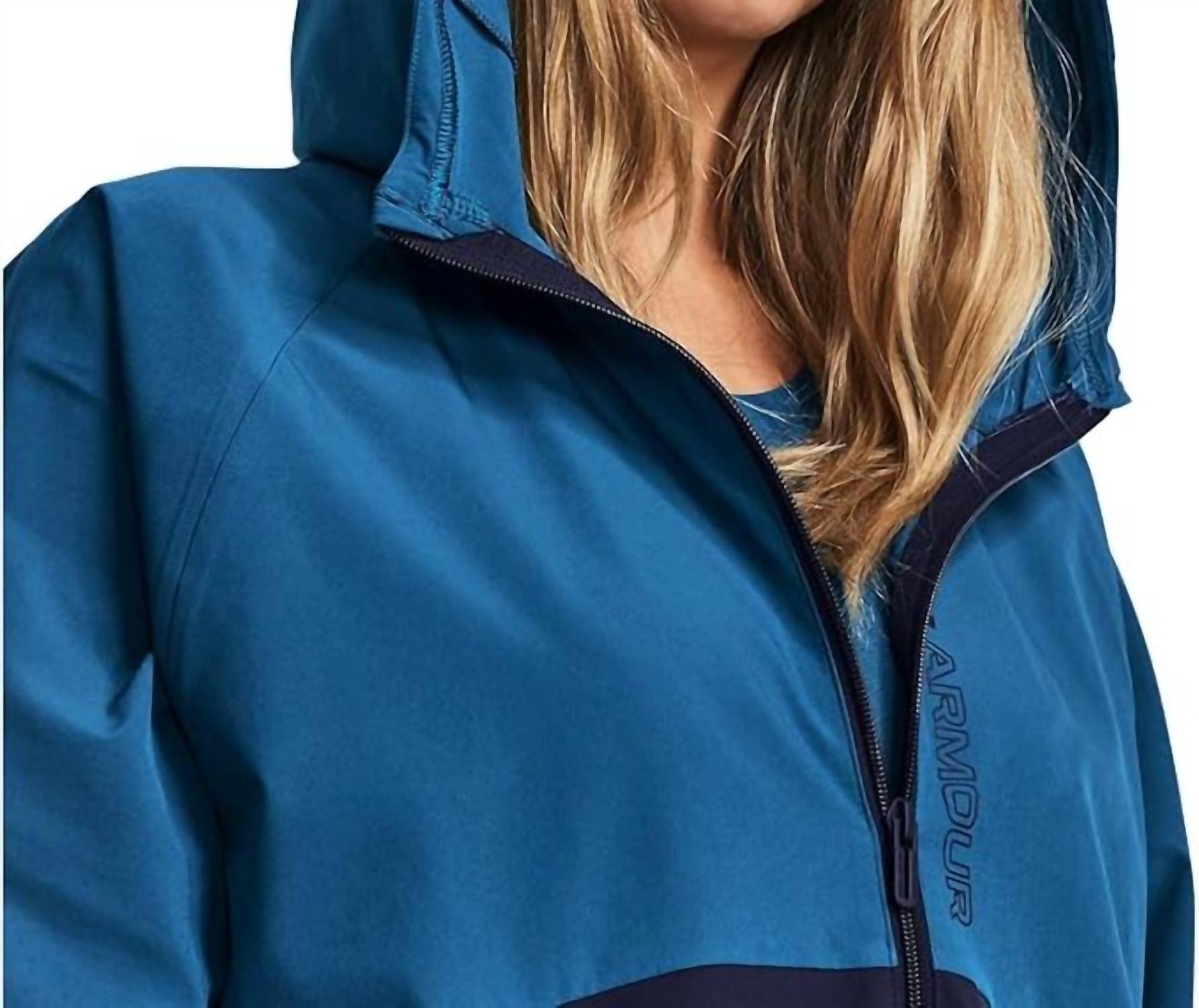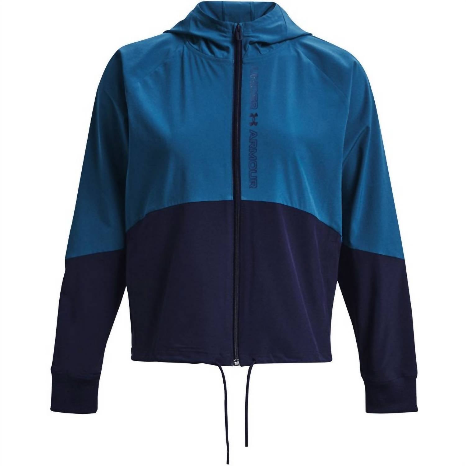 Make any outfit instantly cool by pairing it with this bomber jacket. Introducing the Woven Full Zip Jacket by Under Armour, a must-have for women seeking style and functionality in a blue bomber. This patterned jacket boasts long sleeves and a hooded neckline, featuring UA Storm technology that repels water while maintaining breathability. Made from durable polyester, it includes convenient open hand pockets and a drawcord adjust at the bottom hem for a customizable fit. With a zip closure and ribbed cuffs, this jacket is as easy to maintain as it is to wear, allowing for effortless machine washing.