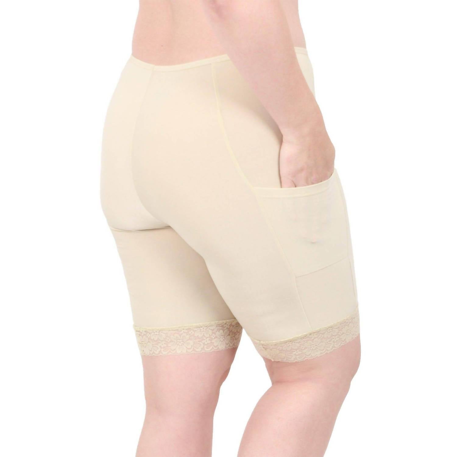 These slipshorts feature two pockets and a signature seamless inner thigh design. The stay-put leg design ensures they stay in place. They have a 100% cotton gusset and are made from 95% performance polyester and 5% spandex. Machine wash cold and machine dry. Made in China.