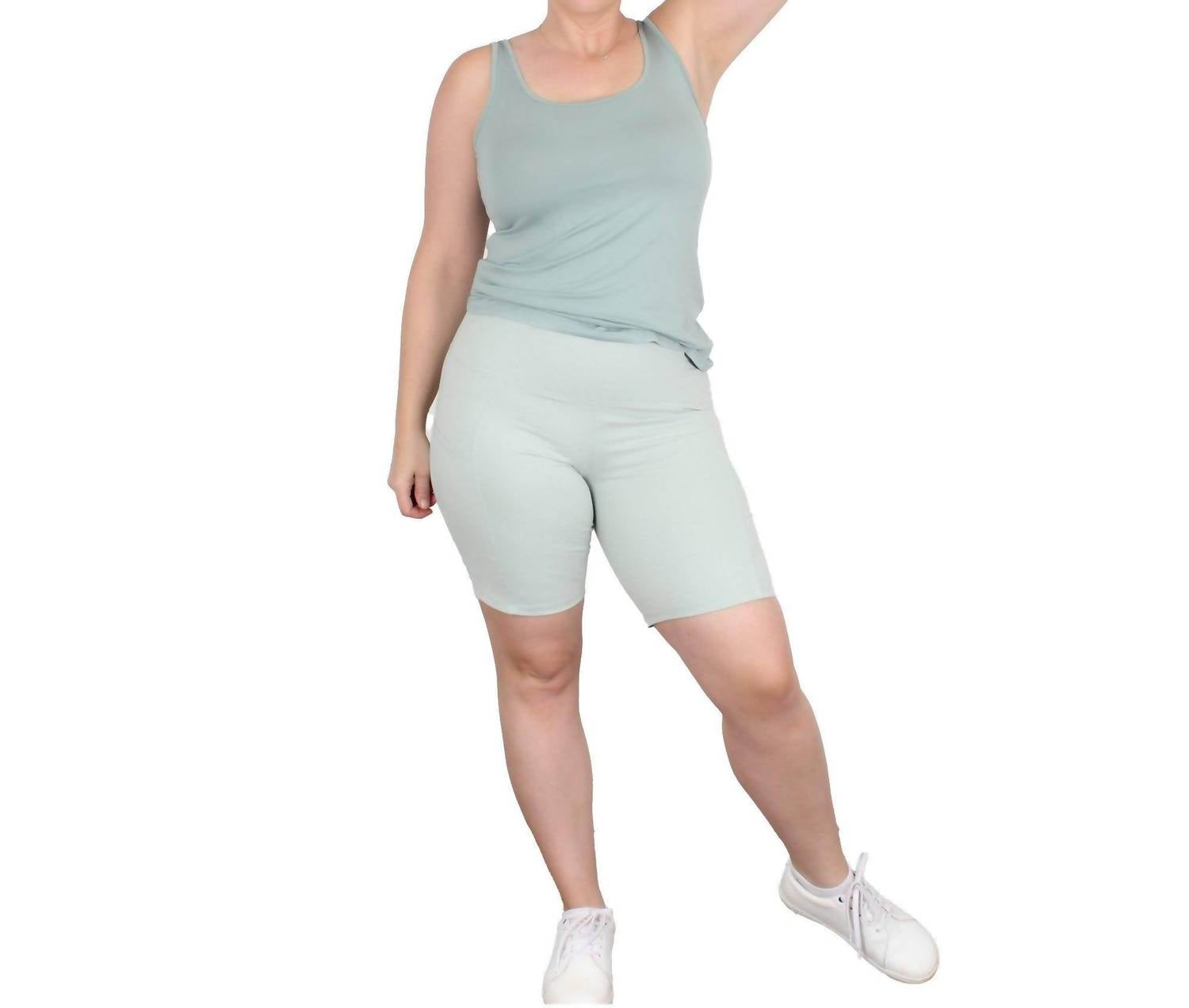 High-waist is here to stay and we especially love this style short. Introducing the Undersummers Flow Bike Shorts in Green Dusty, a perfect blend of comfort and functionality. These shorts feature a high waist with a flattering tummy panel and a seam-free inner thigh, designed to enhance your silhouette. Crafted in the USA from 87% Polyester and 13% Spandex, they include practical pockets for added convenience. Care instructions recommend machine washing cold and hanging to dry.
